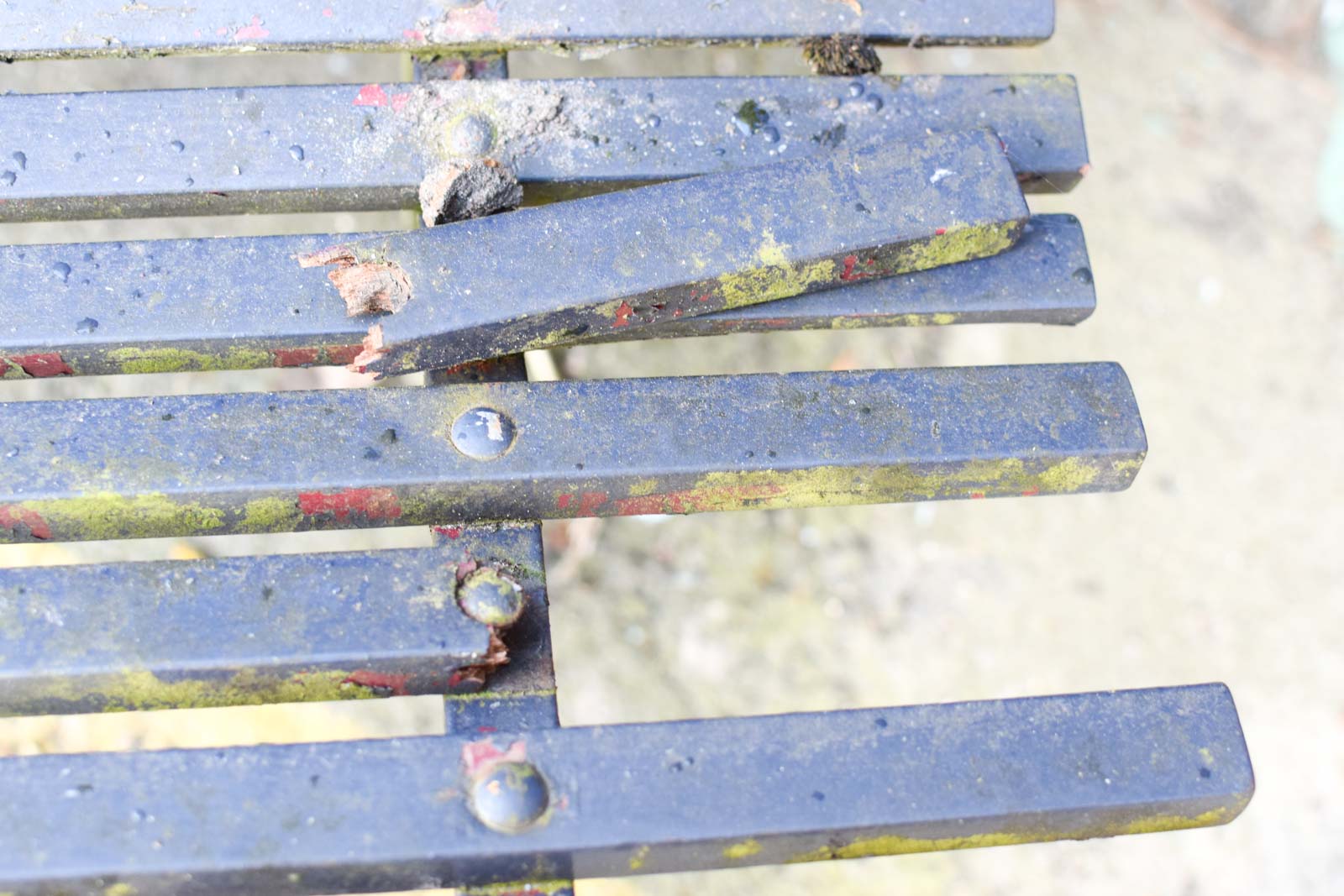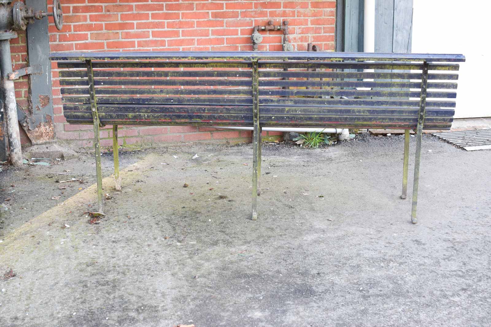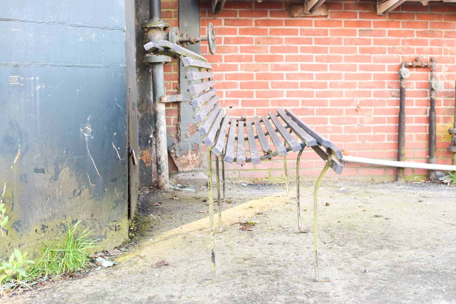 de zitting en zitvlak is van hout de onderstel van metaal de tuinbank is een opknappertje
