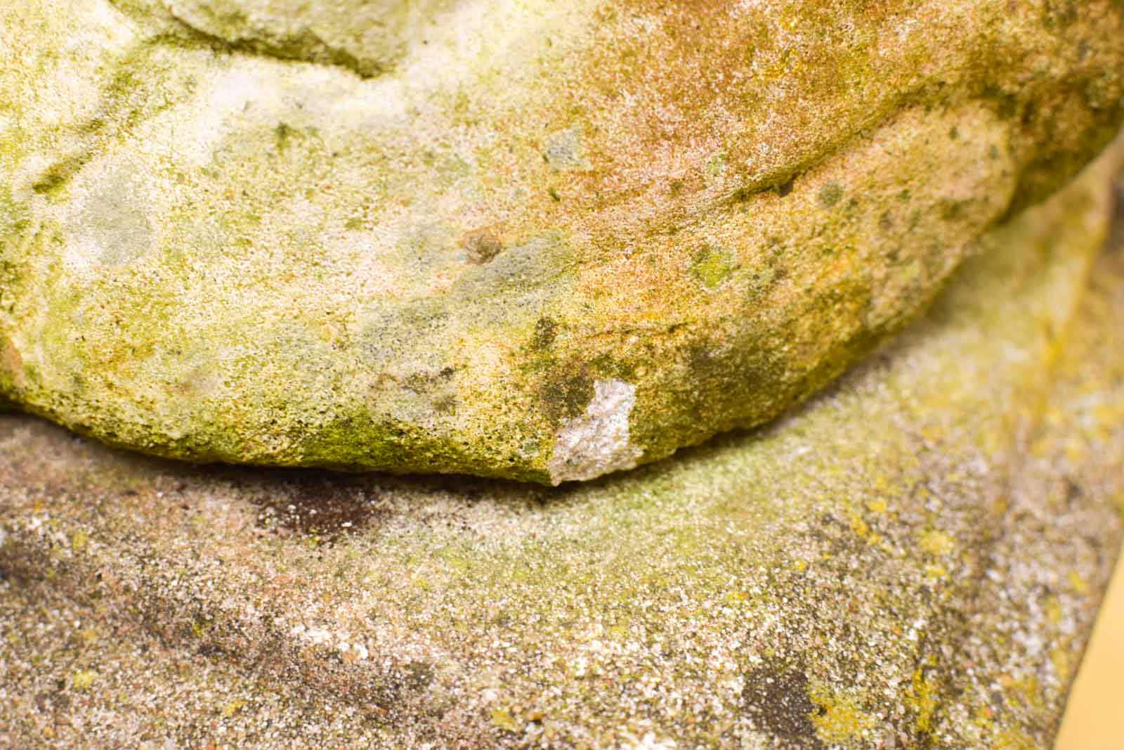 Het beeld is vervaardigd uit steen en heeft zich natuurlijk aangepast aan het buitenklimaat met een groene aanslag, wat kenmerkend is voor tuinbeelden die buiten hebben gestaan. Dit geeft het stuk een gevestigd, organisch karakter.
