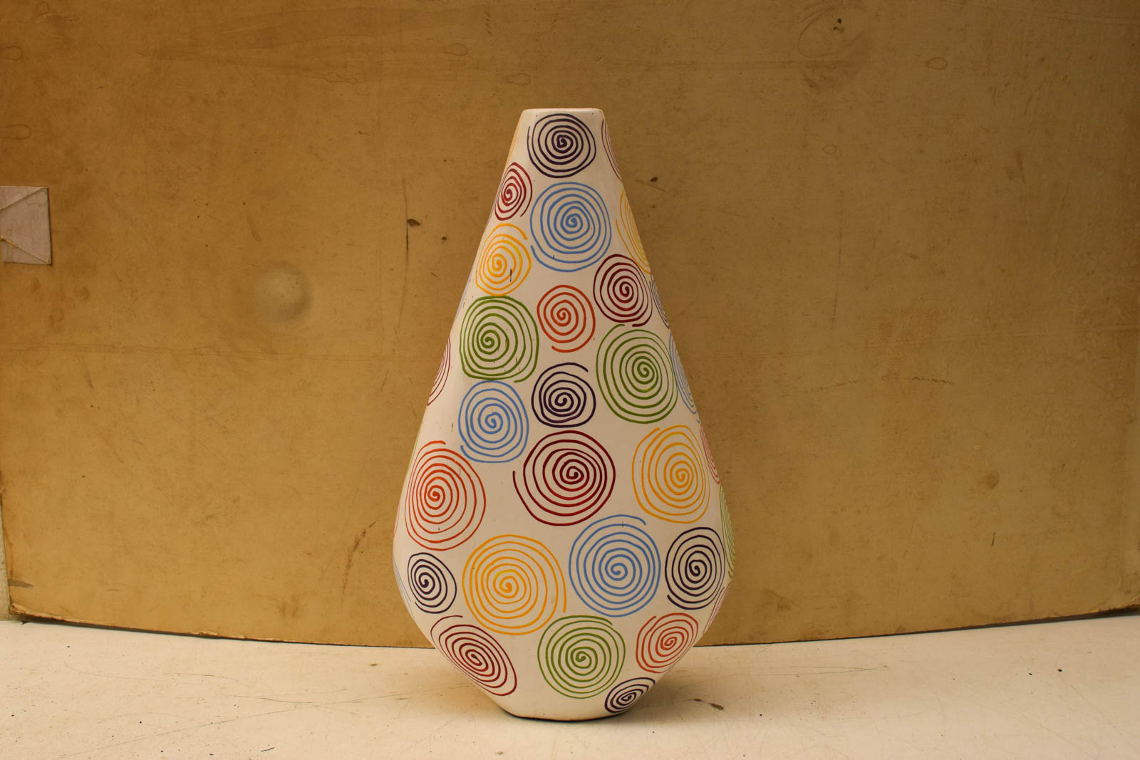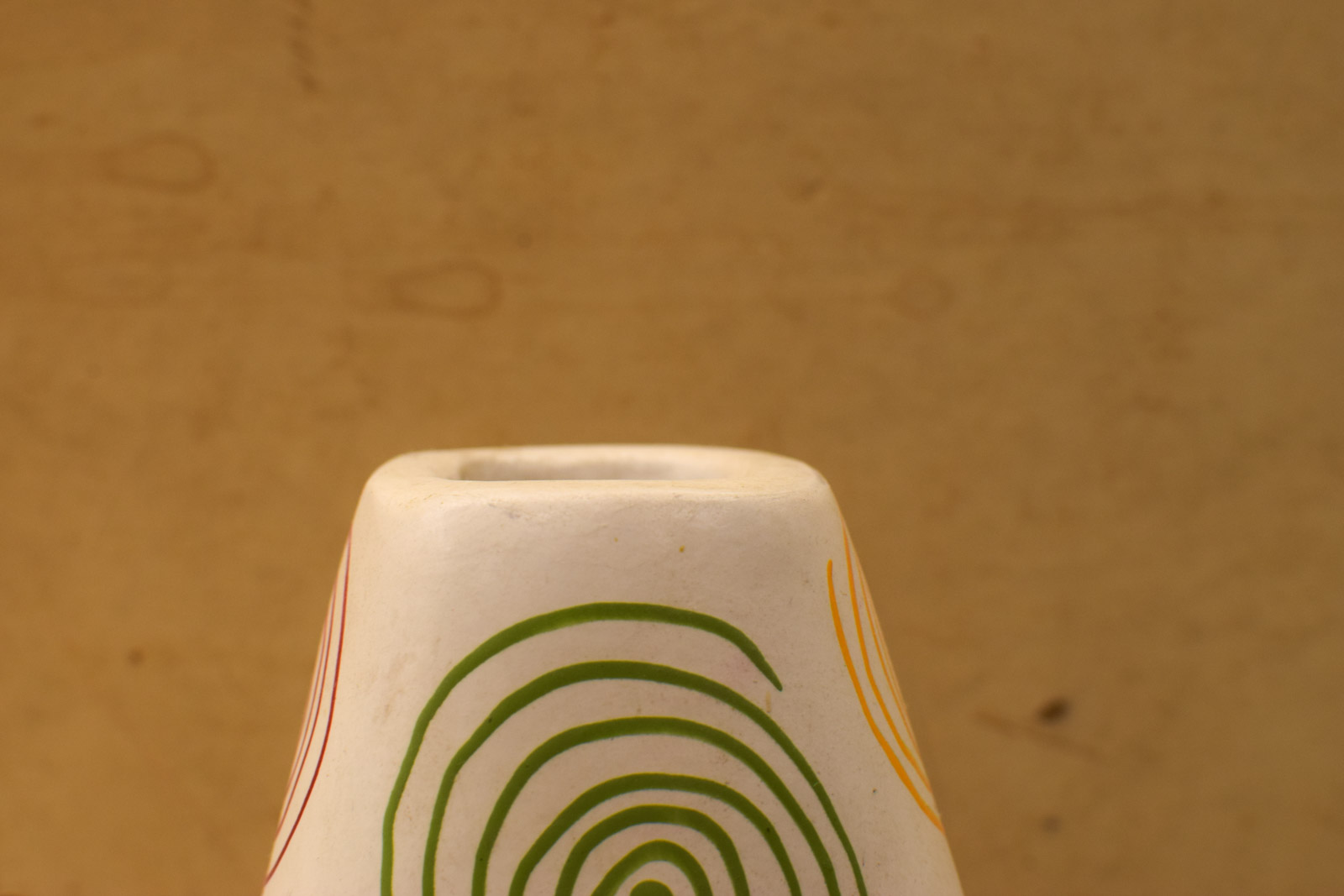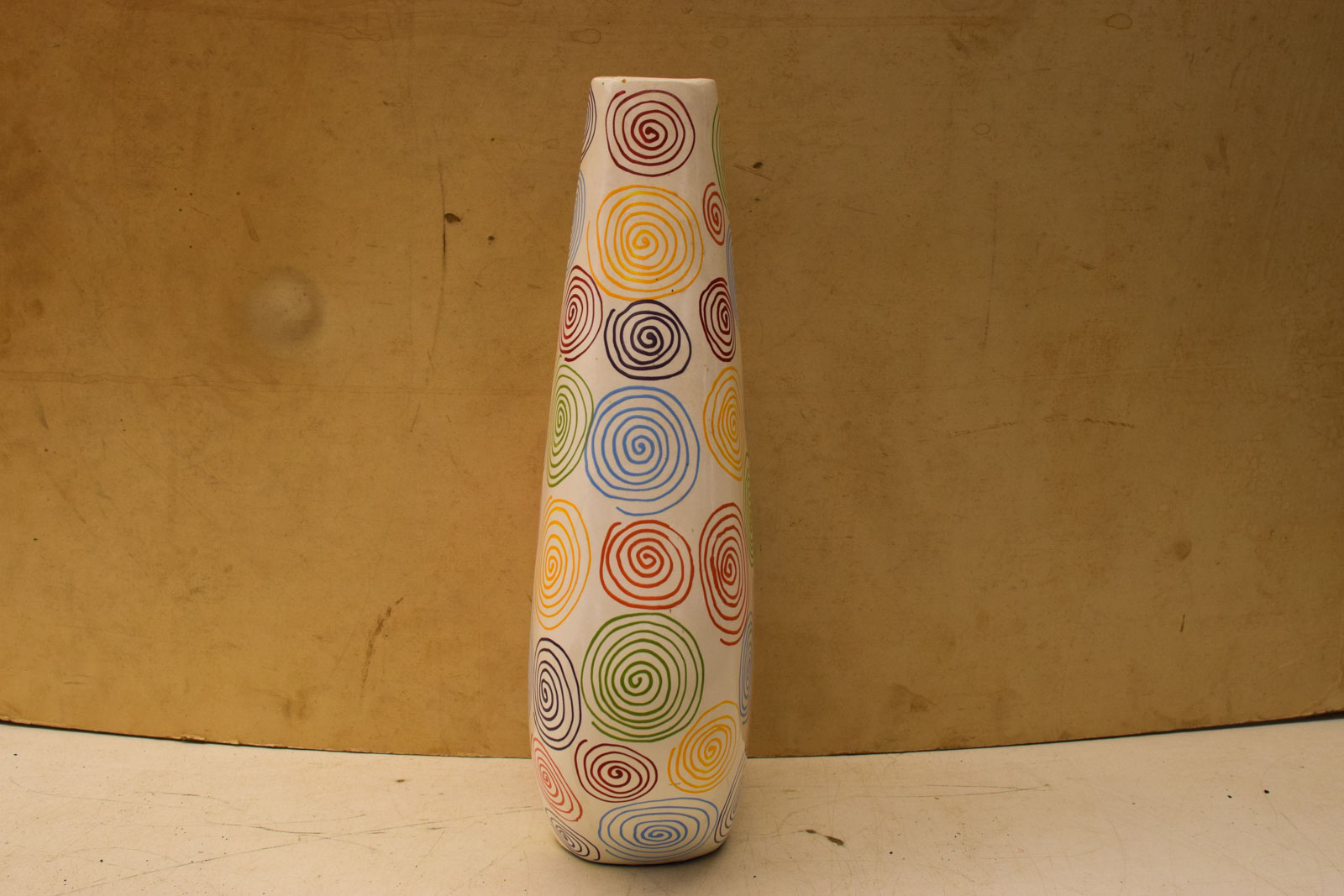 heeft vrolijke kleuren bovenkant opening breed 5 cm diepte 6 cm de vaas heeft een paar vlekjes maar is nog heel en ziet er verder nog goed uit