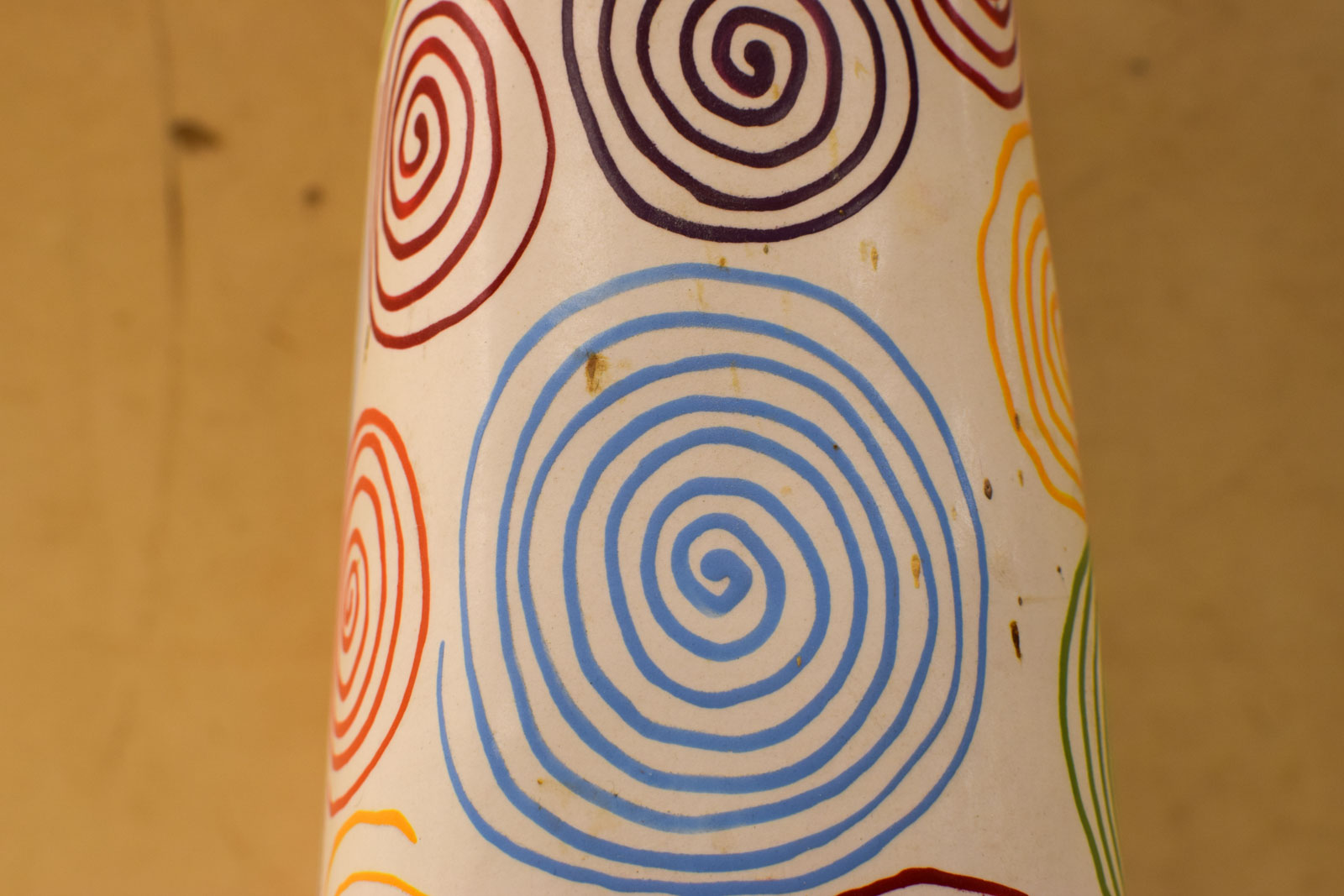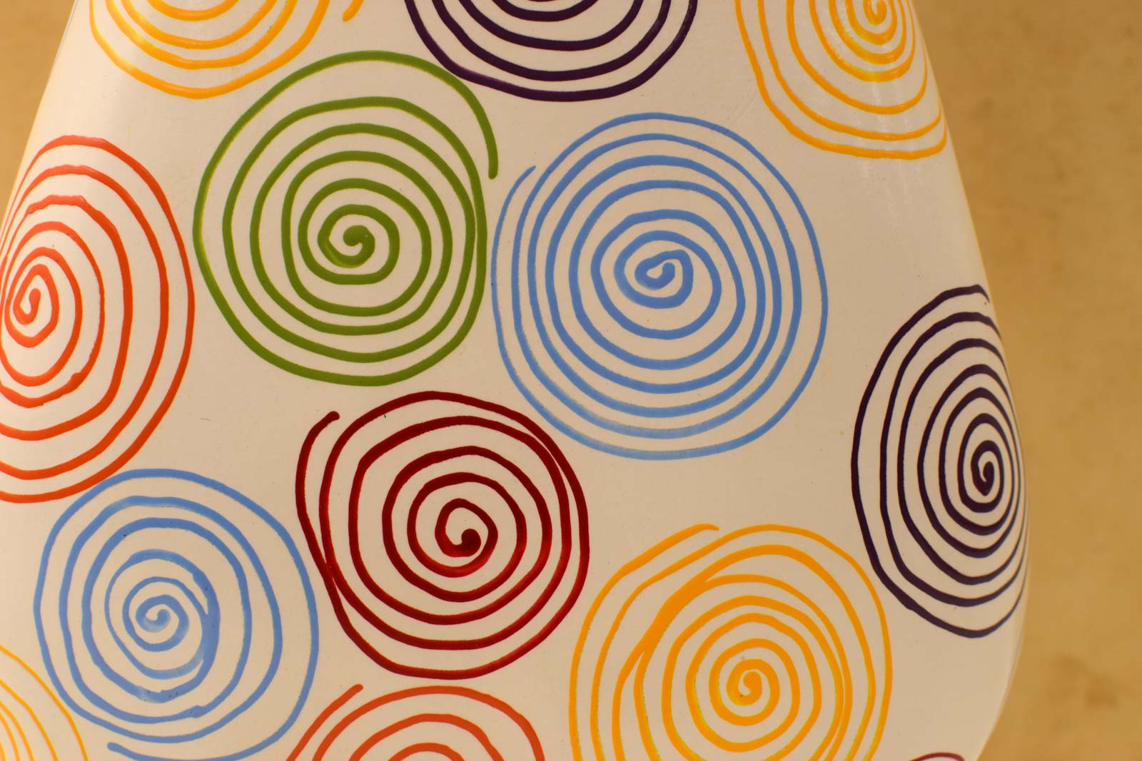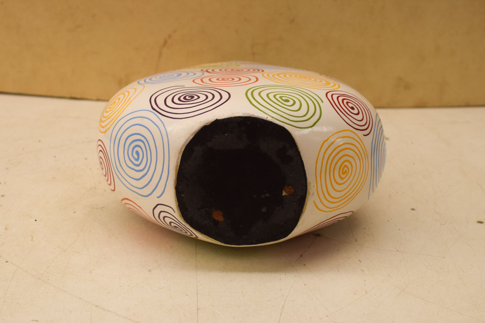 heeft vrolijke kleuren bovenkant opening breed 5 cm diepte 6 cm de vaas heeft een paar vlekjes maar is nog heel en ziet er verder nog goed uit