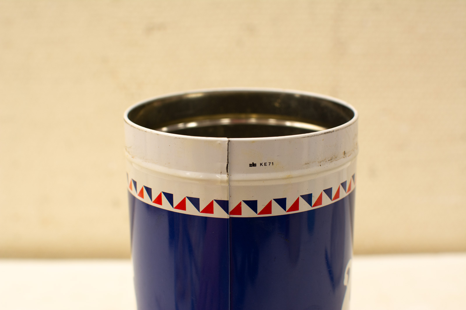 de beschuit blik heeft wat krasjes en roestvlekjes en vlekjes gemeten met deksel hoog 23 cm diameter bovenkant opening 10,5 cm