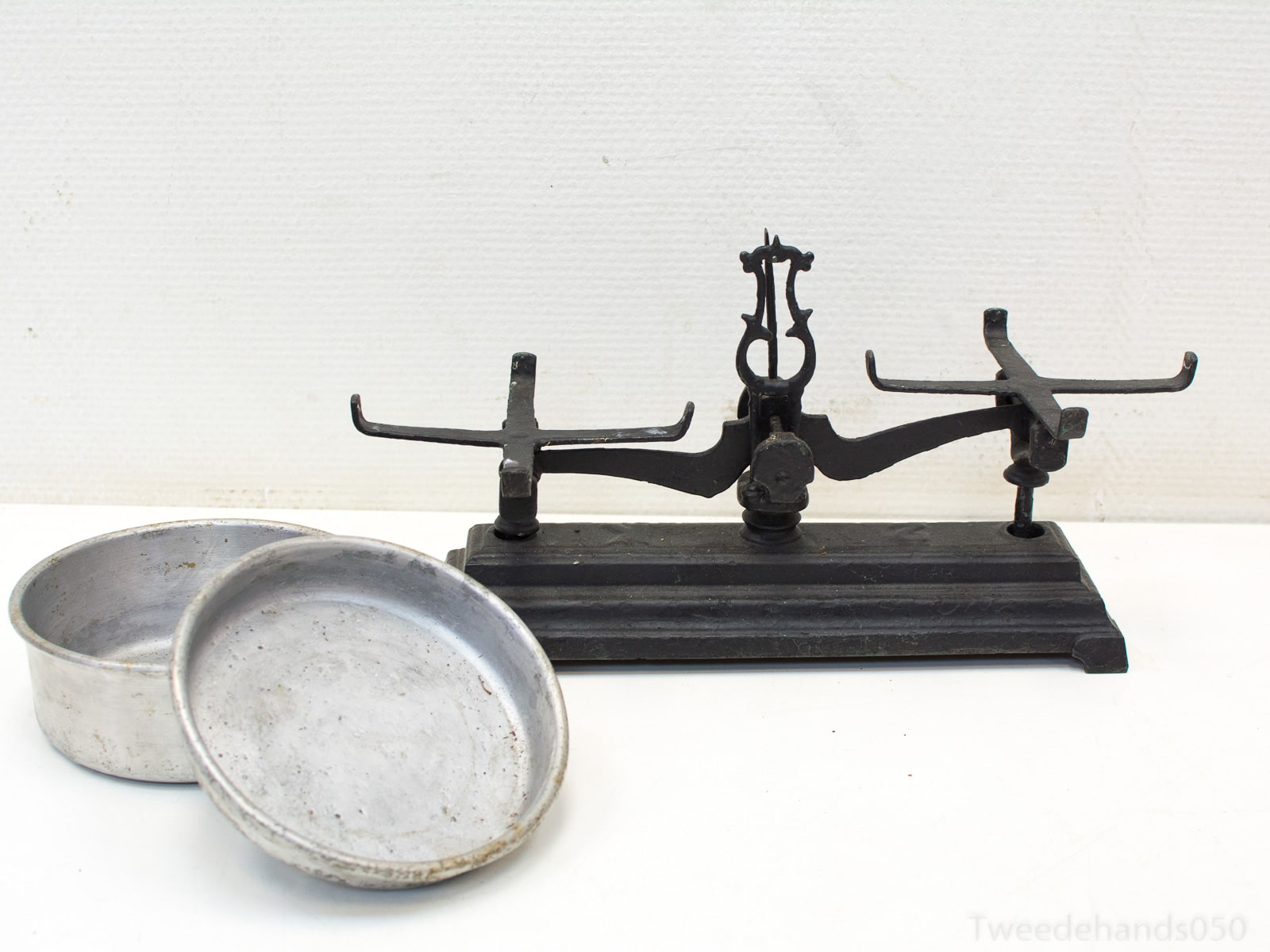 Een oude weegschaal met gietijzeren onderstel en aluminium bakjes. De bakjes zijn 16 x 6 cm en 16 x 2.8 cm en hebben wel gebruikerssporen als kleine gaatjes in de bodem en krassen. Het onderstel is 32 x 8 x 20 cm ( b x d x h ).