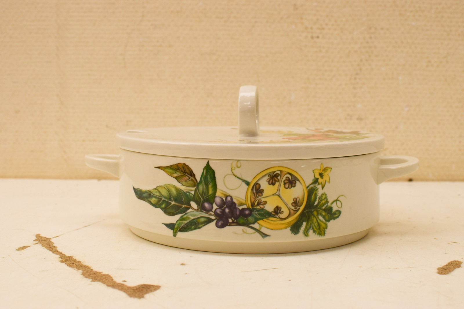 De afmetingen zijn goed proportioneel: zonder deksel meet het stuk 20,5 cm in diameter en 6,5 cm in hoogte. Het porselen is stevig en voelt prettig aan in gebruik. De decoratie met groenten en fruit rond de wanden geeft het een warme, klassieke uitstraling die goed past in een traditionele of vintage keukensstijl.