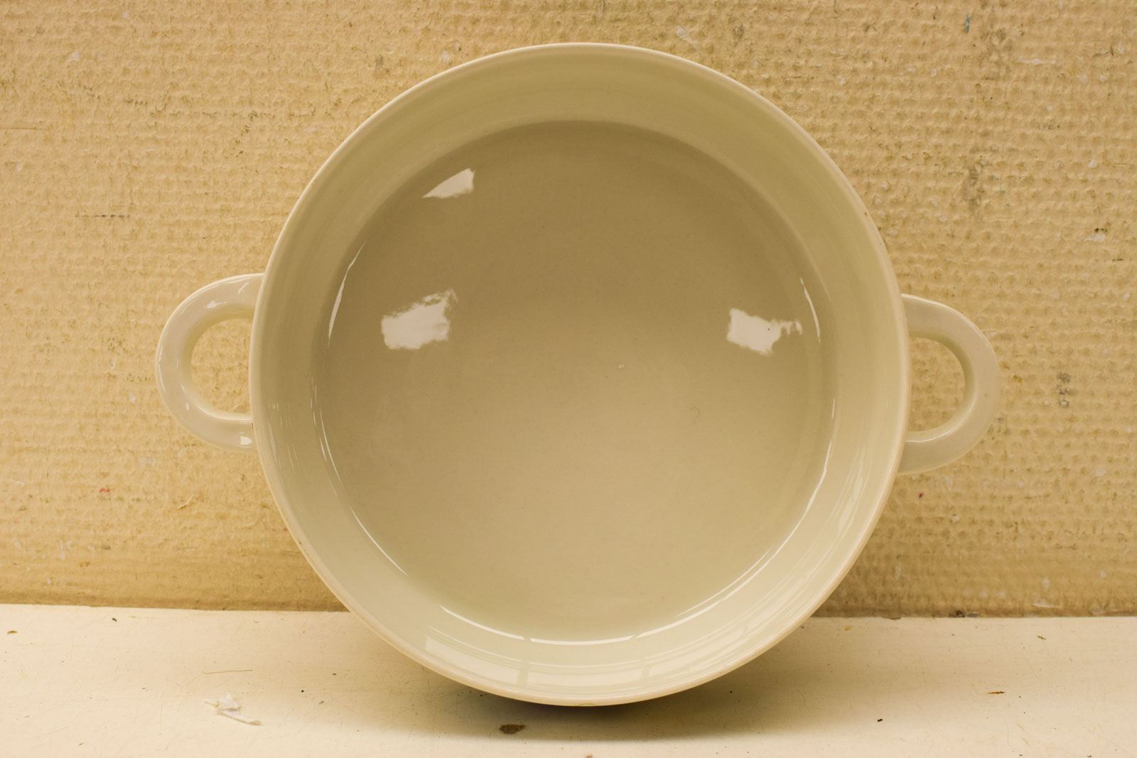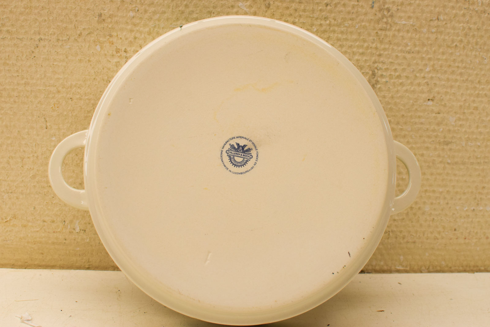 De staat is redelijk tot goed. Het stuk vertoont normale gebruikssporen die passen bij de leeftijd en vorig gebruik. De glazuur is intakt en de decoratie nog duidelijk zichtbaar. Dit is een praktisch servieesstuk dat nog volop bruikbaar is voor het serveren van soep of andere gerechtjes.