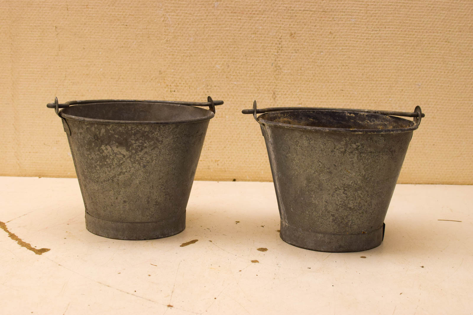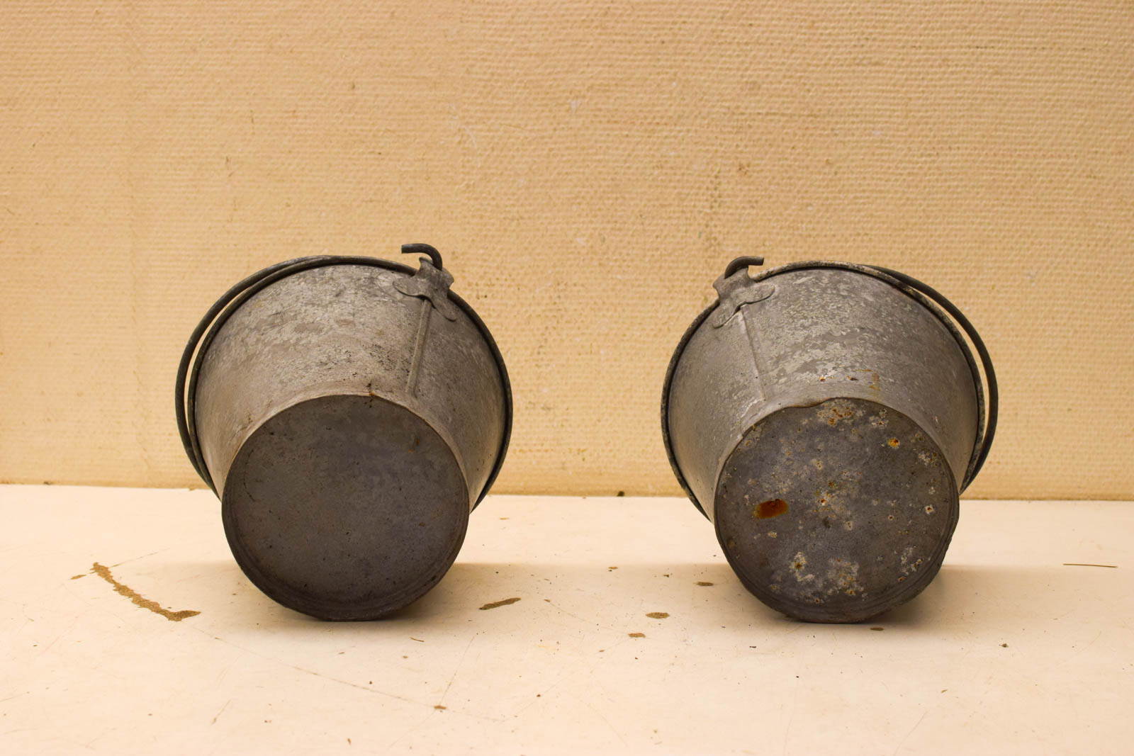 1 emmer heeft roest aan de binnenkant ze zijn beiden gebruikt en hebben gebruikssporen diameter bovenkant opening 21 cm gemeten zonder hendel hoog 17 cm zijn geen gaatjes op de bodem
