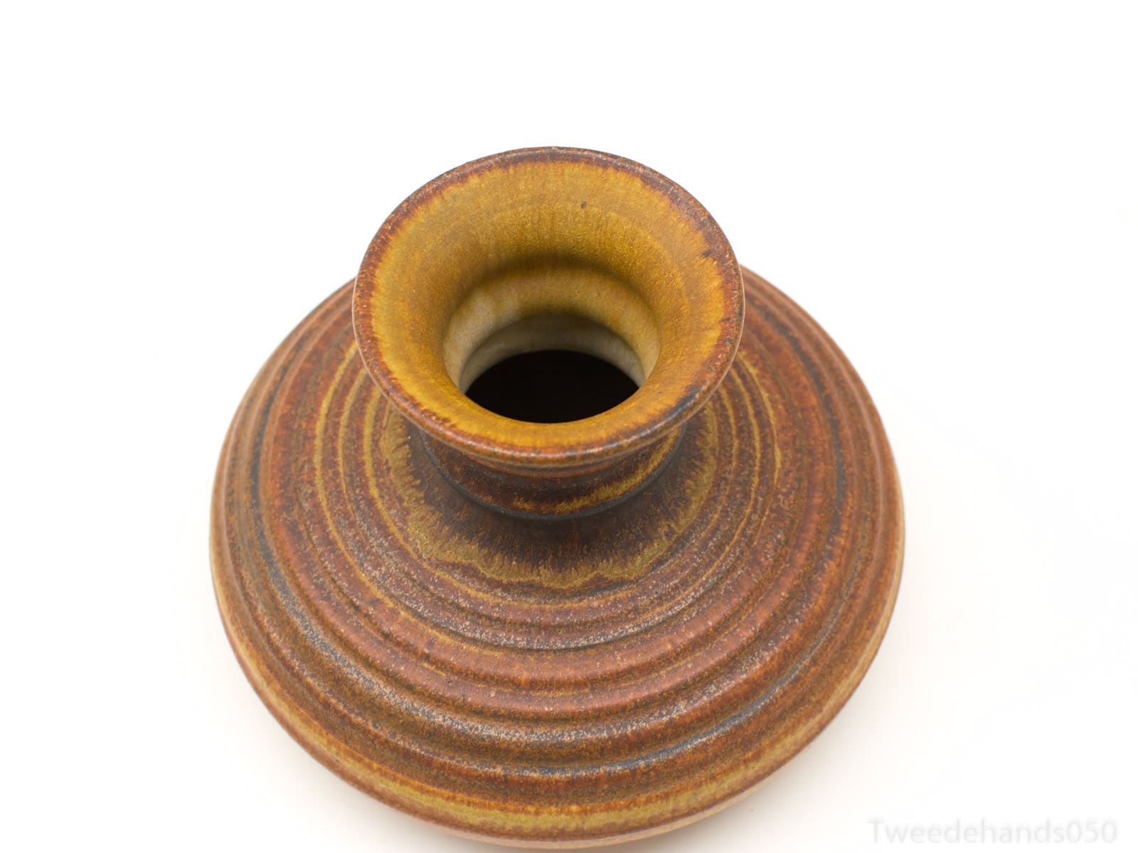 Mooie ronde lage vaas van aardewerk in aarde tinten.