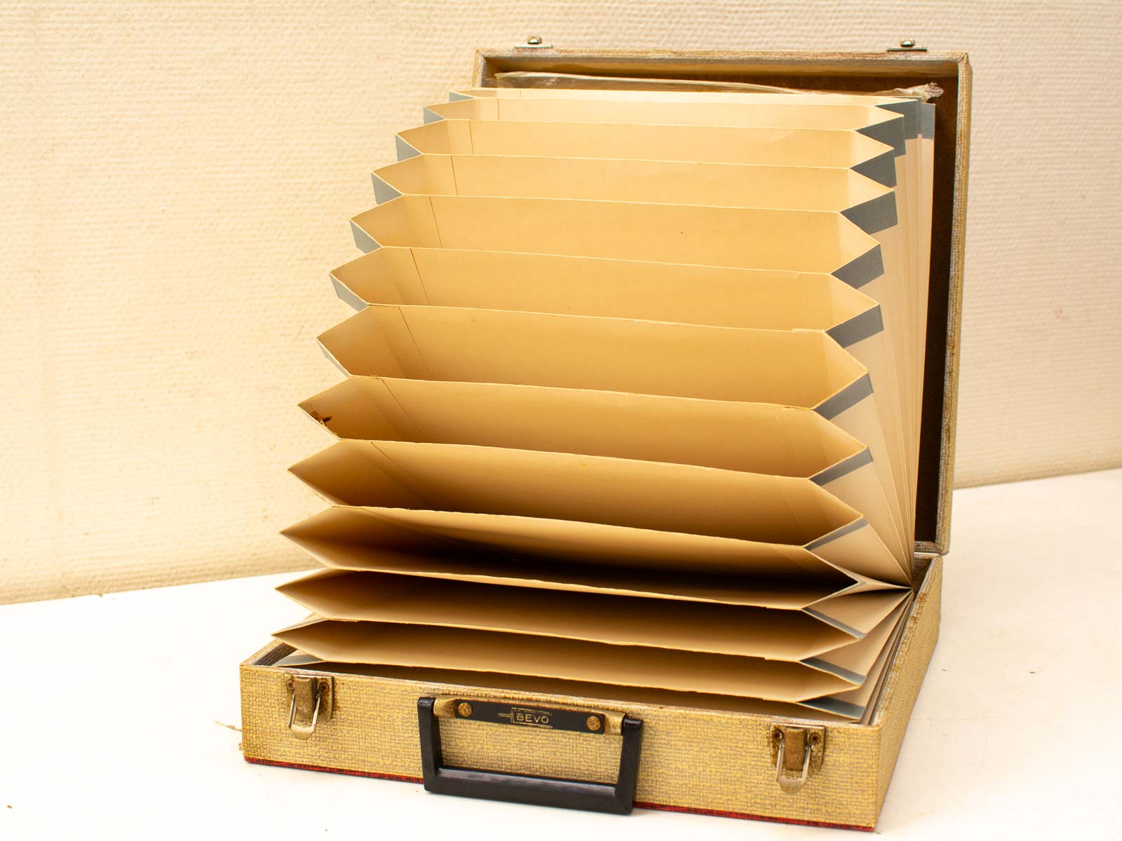 gemeten zoals op de laatste foto hoog 11,5 cm de koffer heeft ruimte voor 25 lp/platen de koffer heeft verkleuring aan de buitenkant