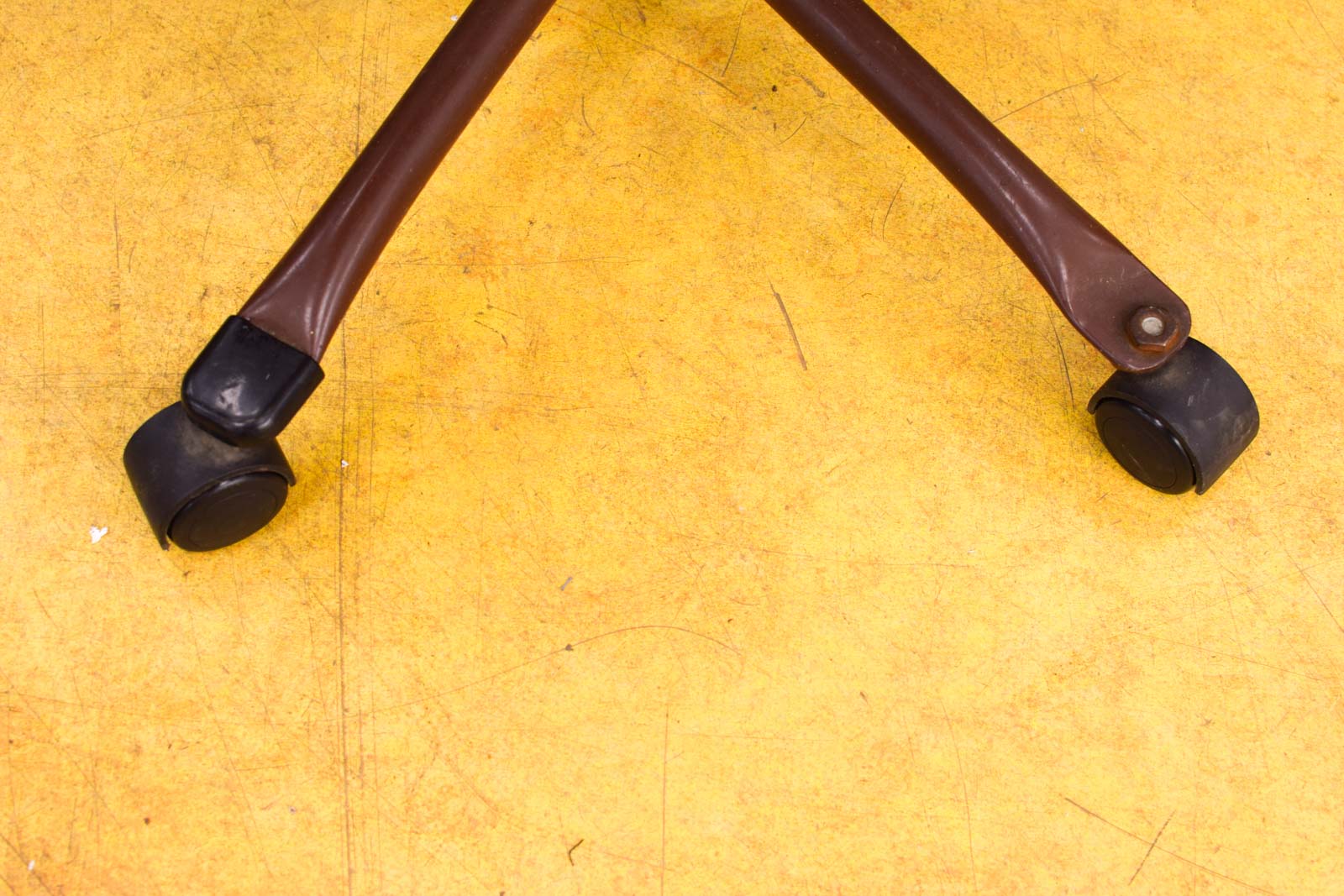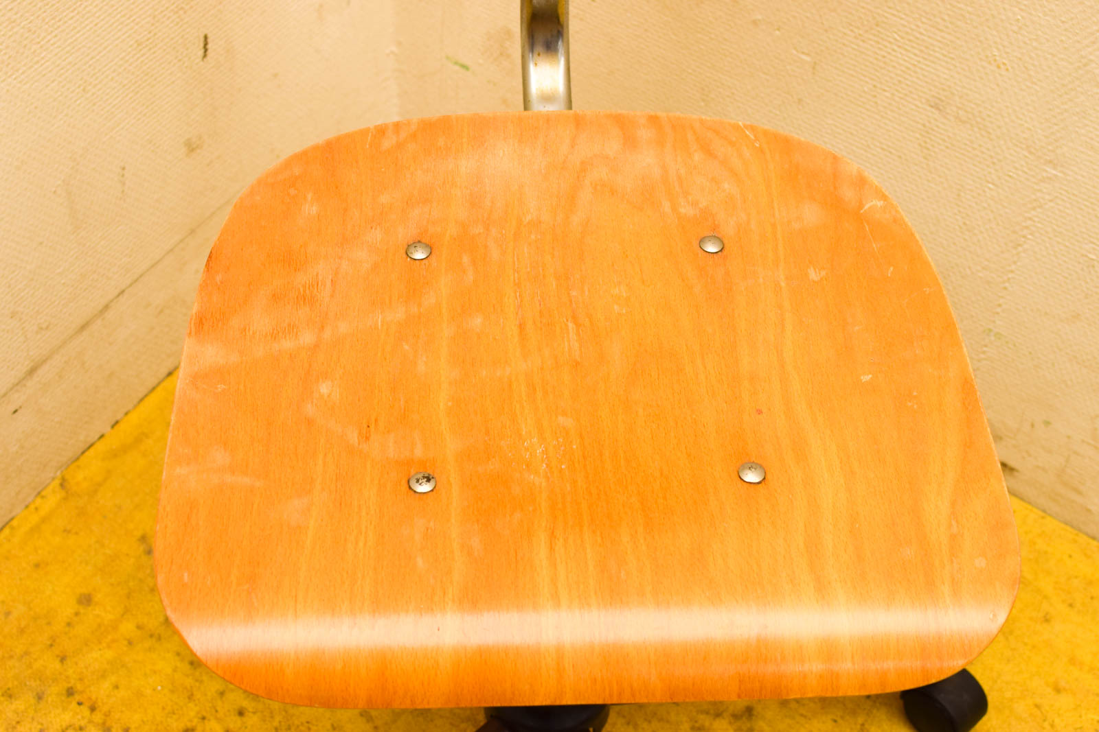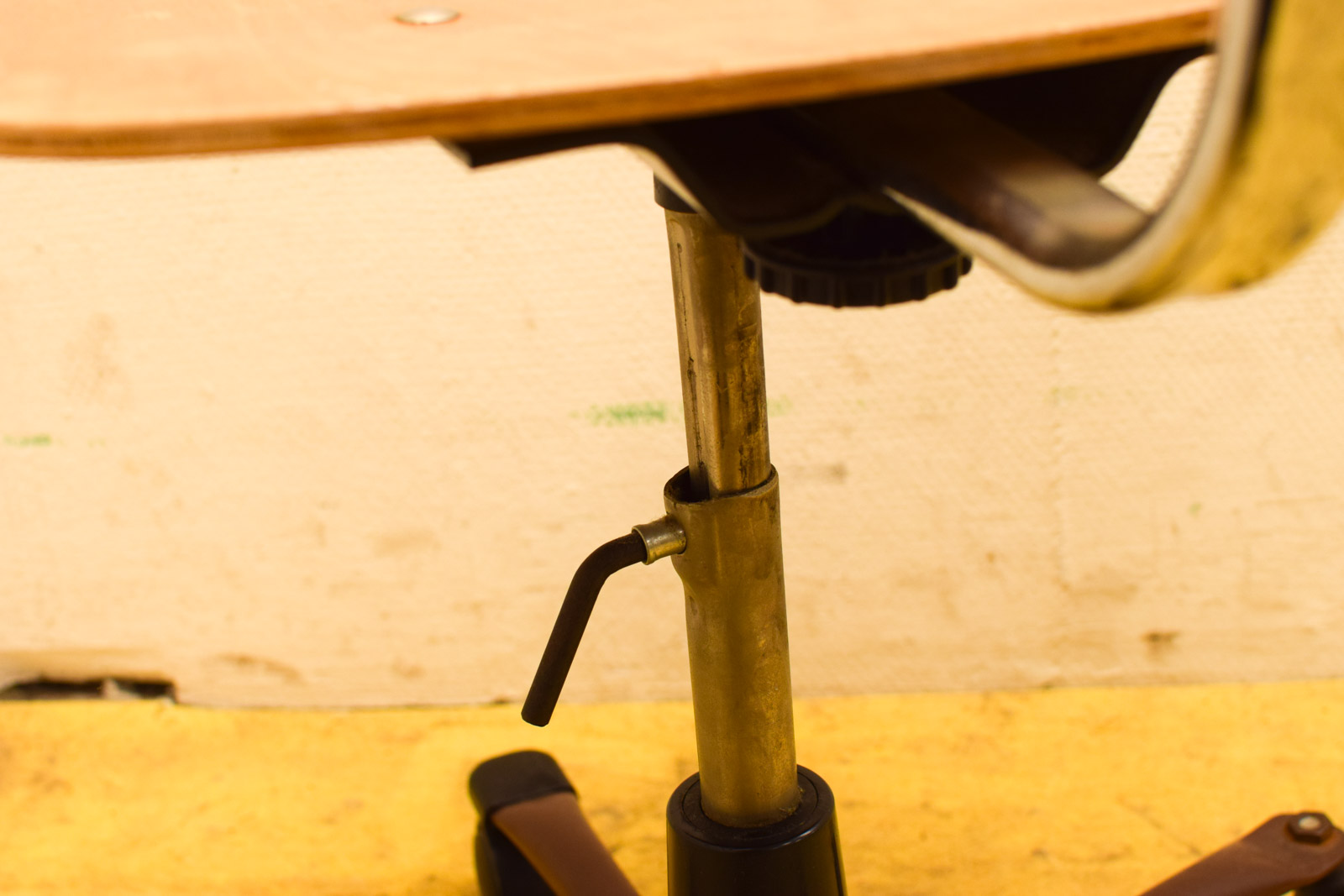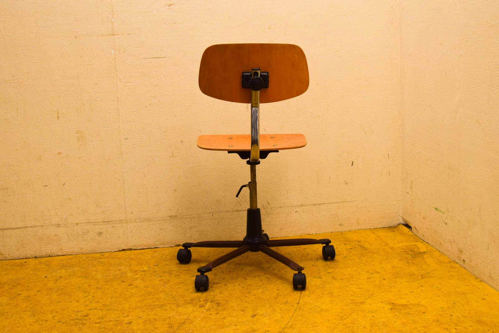 Vintage bureaustoel met gebogen houten zitting en rug op een metalen stervoet, met in hoogte verstelbaar onderstel via klemhendel, volledig functioneel en met fraai patina en normale gebruikssporen.