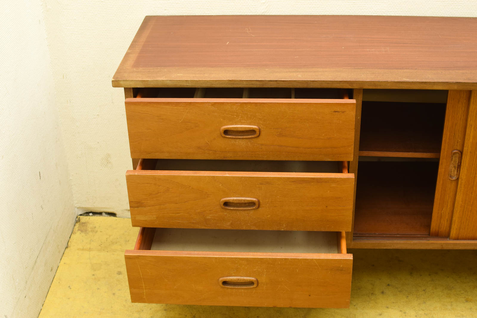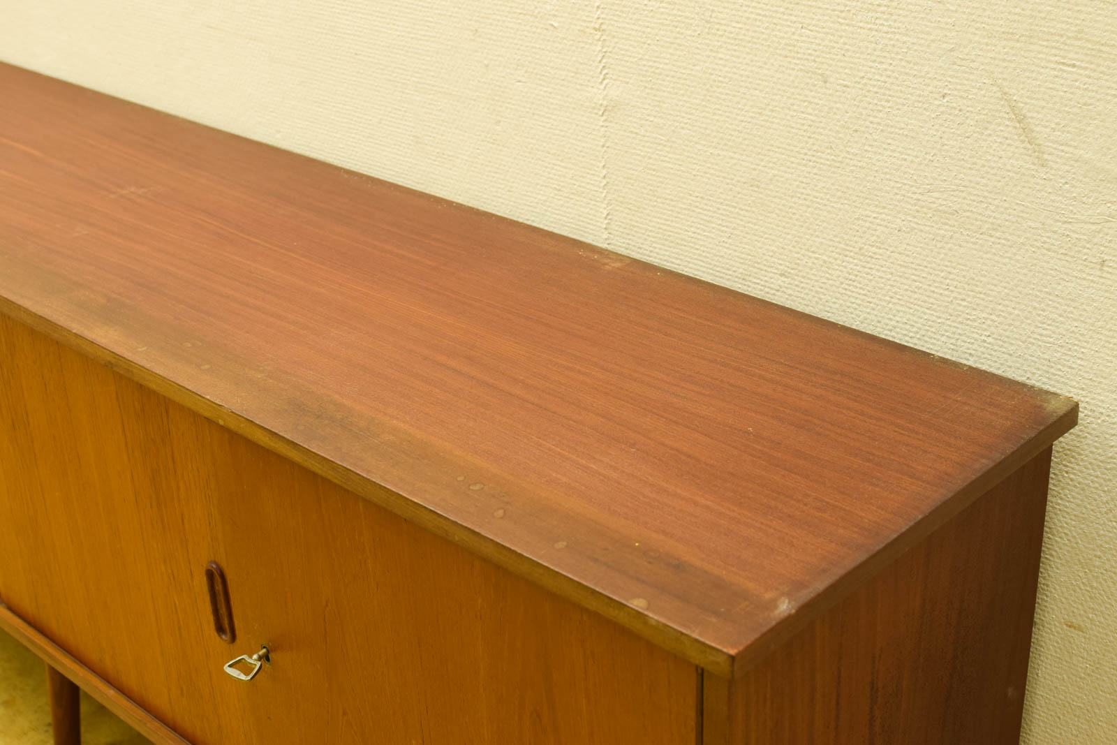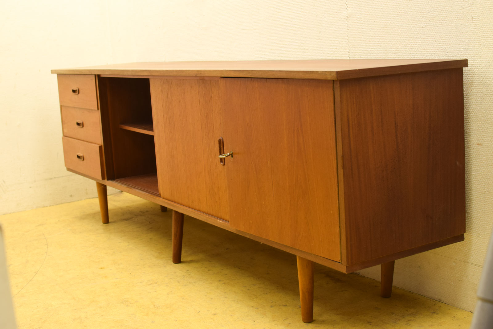 het is een laag model de dressoir heeft gebruikerssporen maar is nog heel er is een sleutel bij de kast