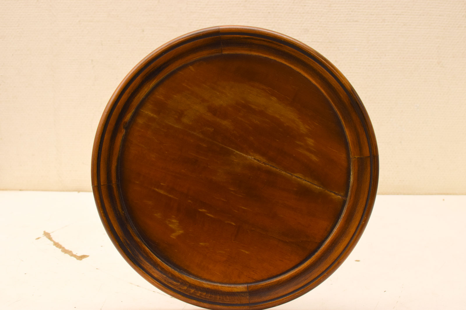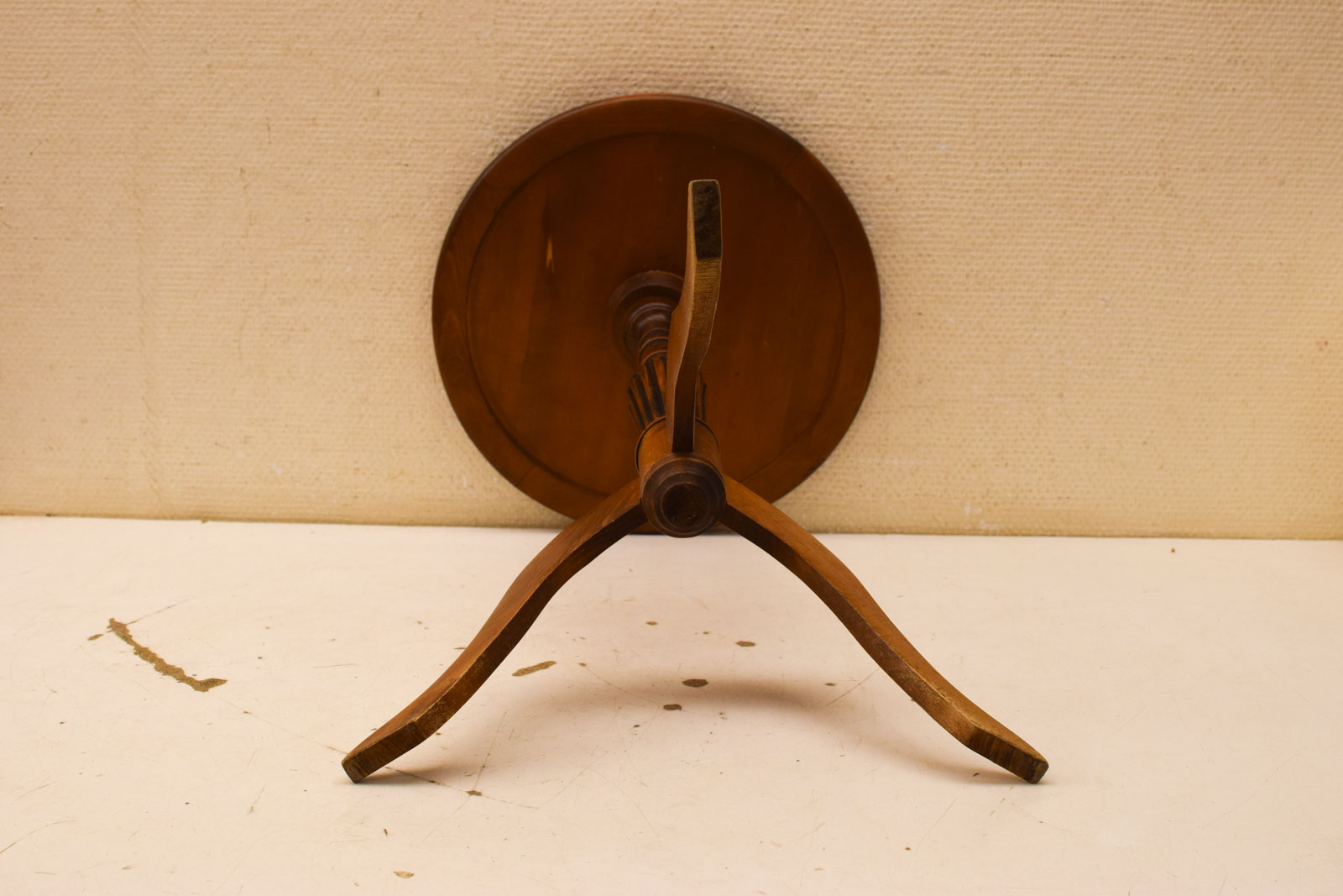 Dit vintage houten bijzettafeltje is een fijne aanvulling voor wie van klassieke, tijdloze meubels houdt. Met drie elegante gebogen poten en een diameter van 34 centimeter past het goed weg als plant- of bijzettafel in een hoek of naast een stoel. De hoogte van 60 centimeter maakt het bruikbaar als plantentafel of voor het neerzetten van een kopje thee en een boek.