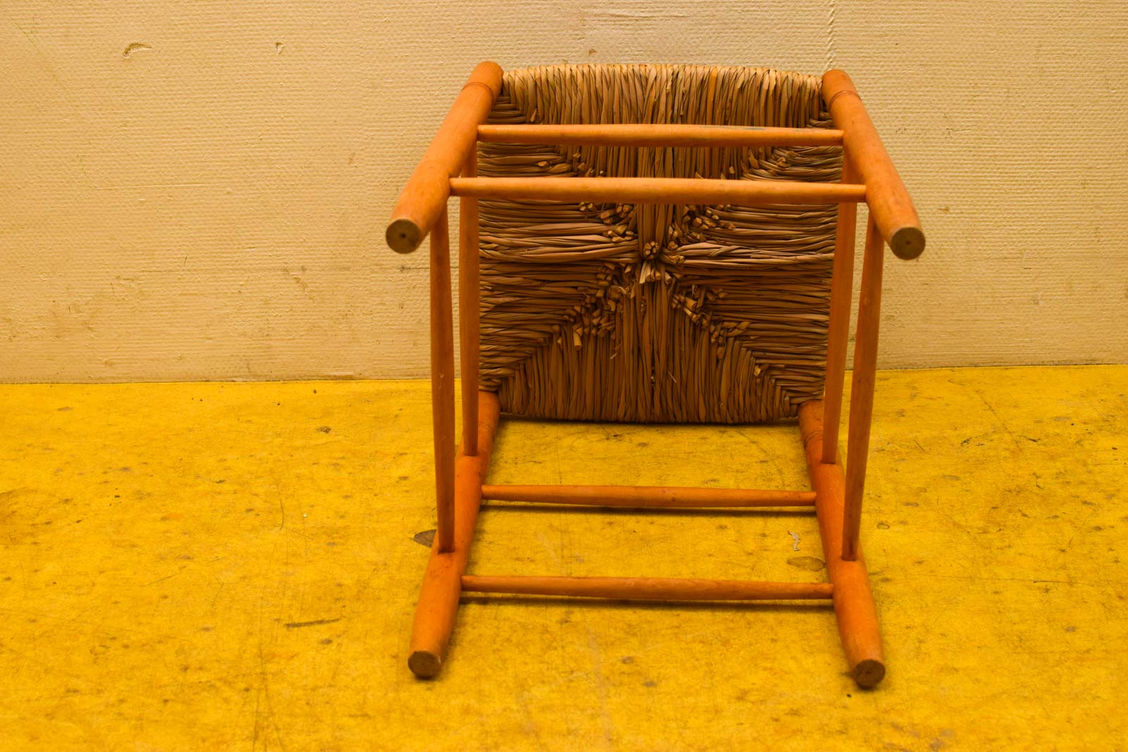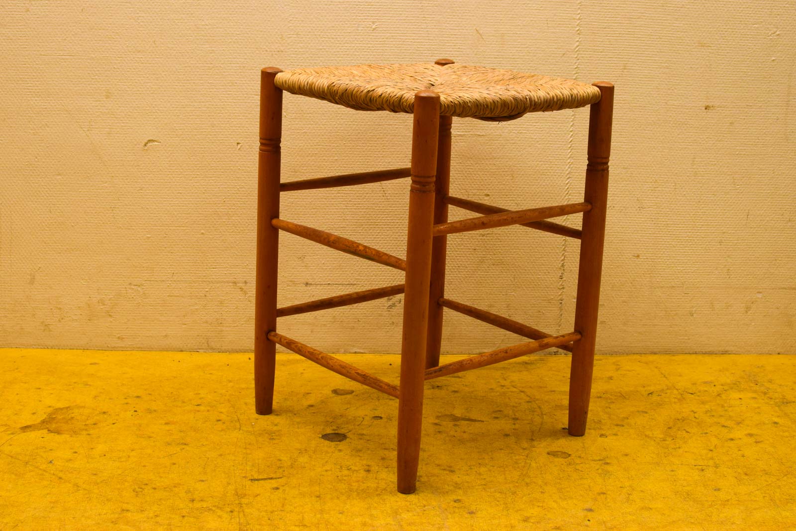Vintage houten kruk met rieten zitting 47773