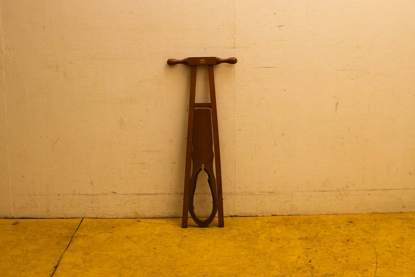 Dit is een vintage houten schoenen uitrekhulp, een praktisch hulpstukje uit het verleden dat je helpt je schoenen uit te trekken zonder je te buigen of je handen te gebruiken. Het ontwerp is eenvoudig maar doeltreffend: twee verticale houten stijlen met bovenaan een dwarsligger met gedraaide handgrepen, en onderaan een ovale lus waar je hiel in plaats.