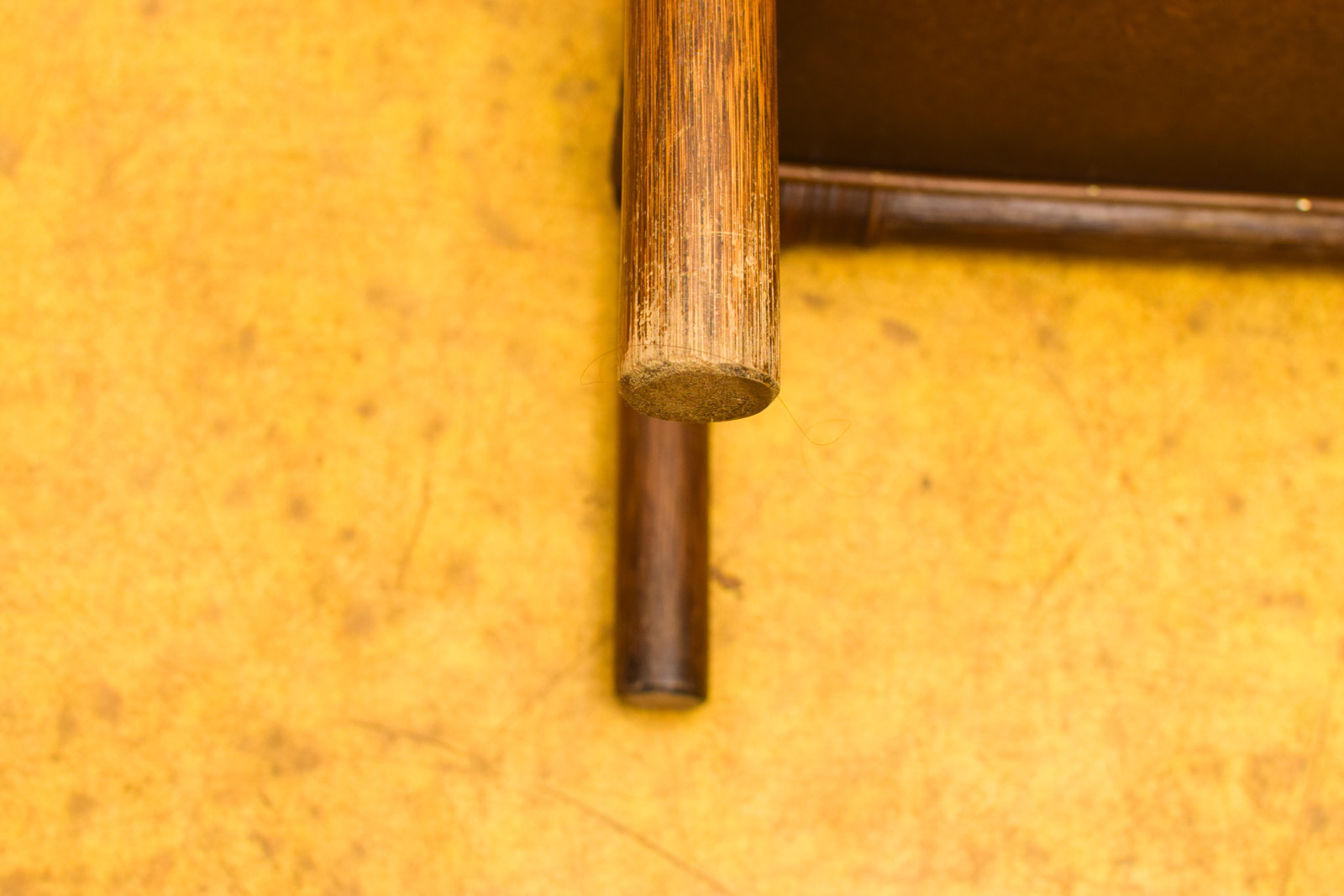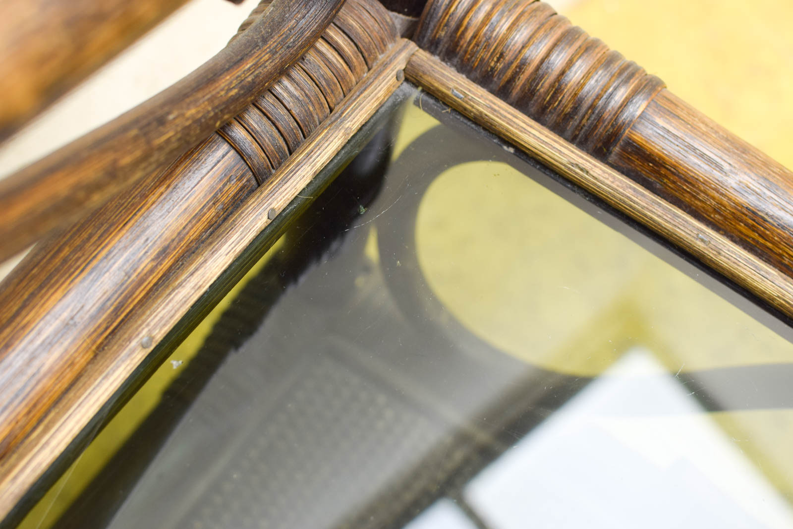 Wat betreft de staat: het glas heeft lichte krasjes en het hout vertoont wat verkleuring, wat je op de detailfoto’s goed kunt zien. Dit zijn normale gebruikssporen voor een kastje van deze leeftijd. Voor de rest ziet het er redelijk uit en is stabiel.