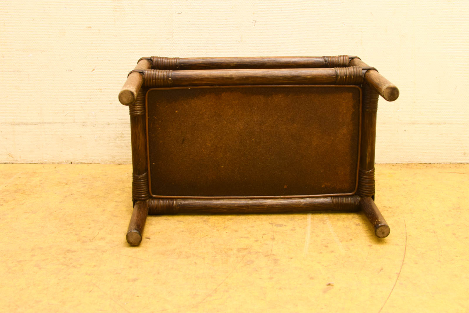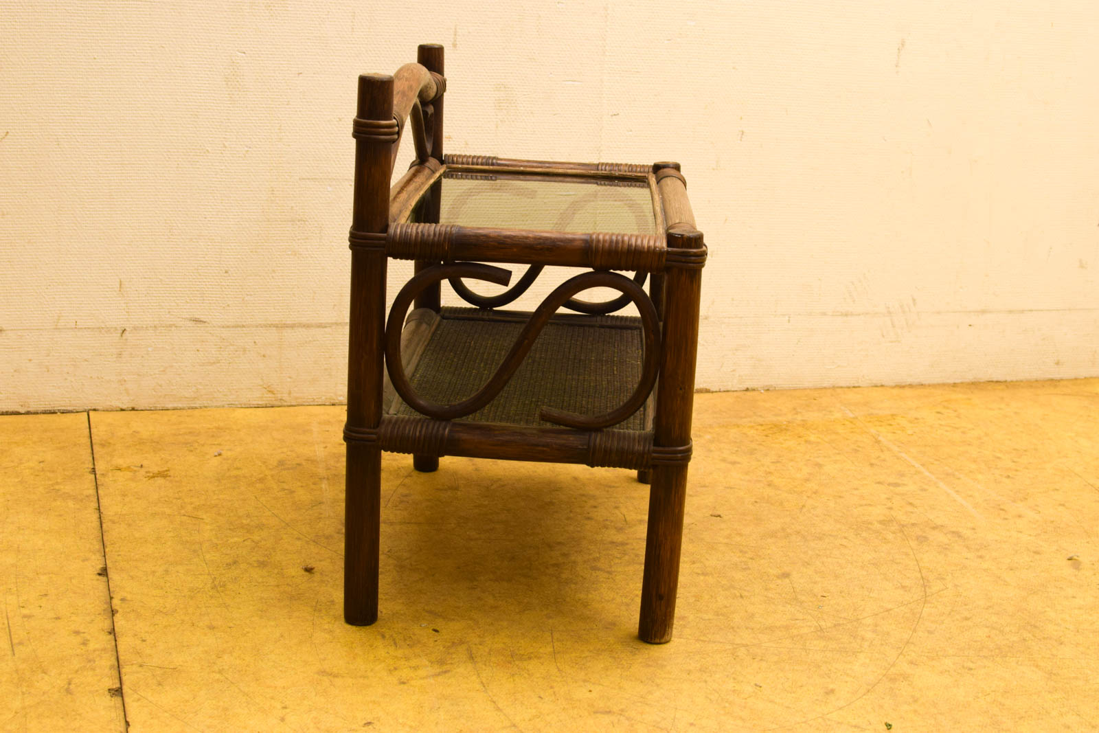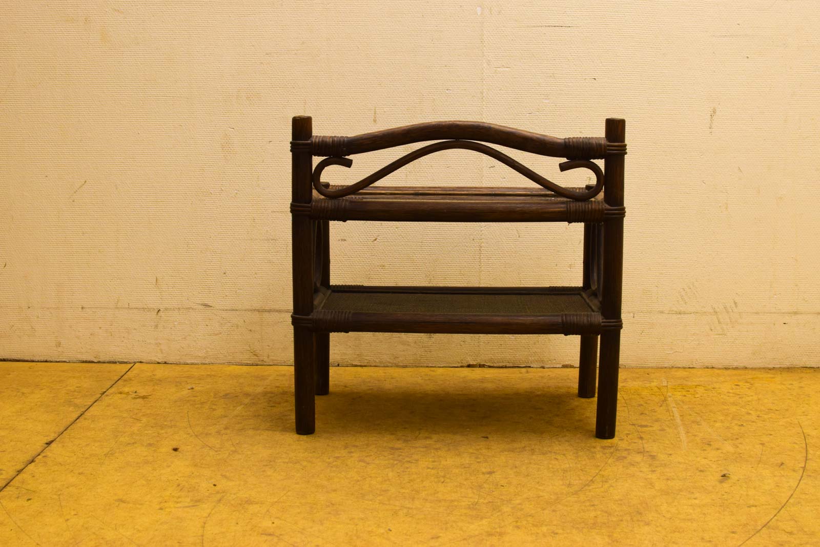 Het kastje is gemaakt van hout met een warme bruine afwerking en houten draagstukken met een gewikkeld detail aan de hoeken. Dit soort rotan- of ratanachtige afwerkingen waren populair in vintage interieurdesign, met name in de jaren 50 tot 70, wanneer natuurlijke materialen en open kastjes veel gebruikt werden in huiskamers en slaapkamers.