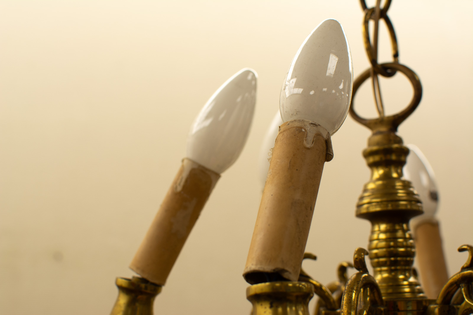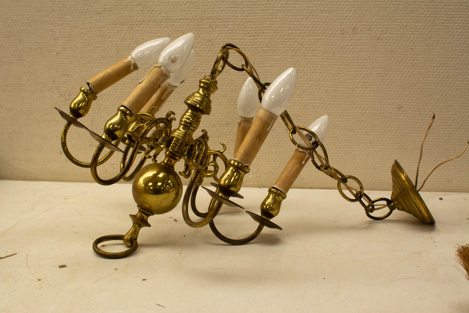 heeft 6 armen de kaarsjes staan iets scheef de lamp is goudkleurig de lamp is zwaar