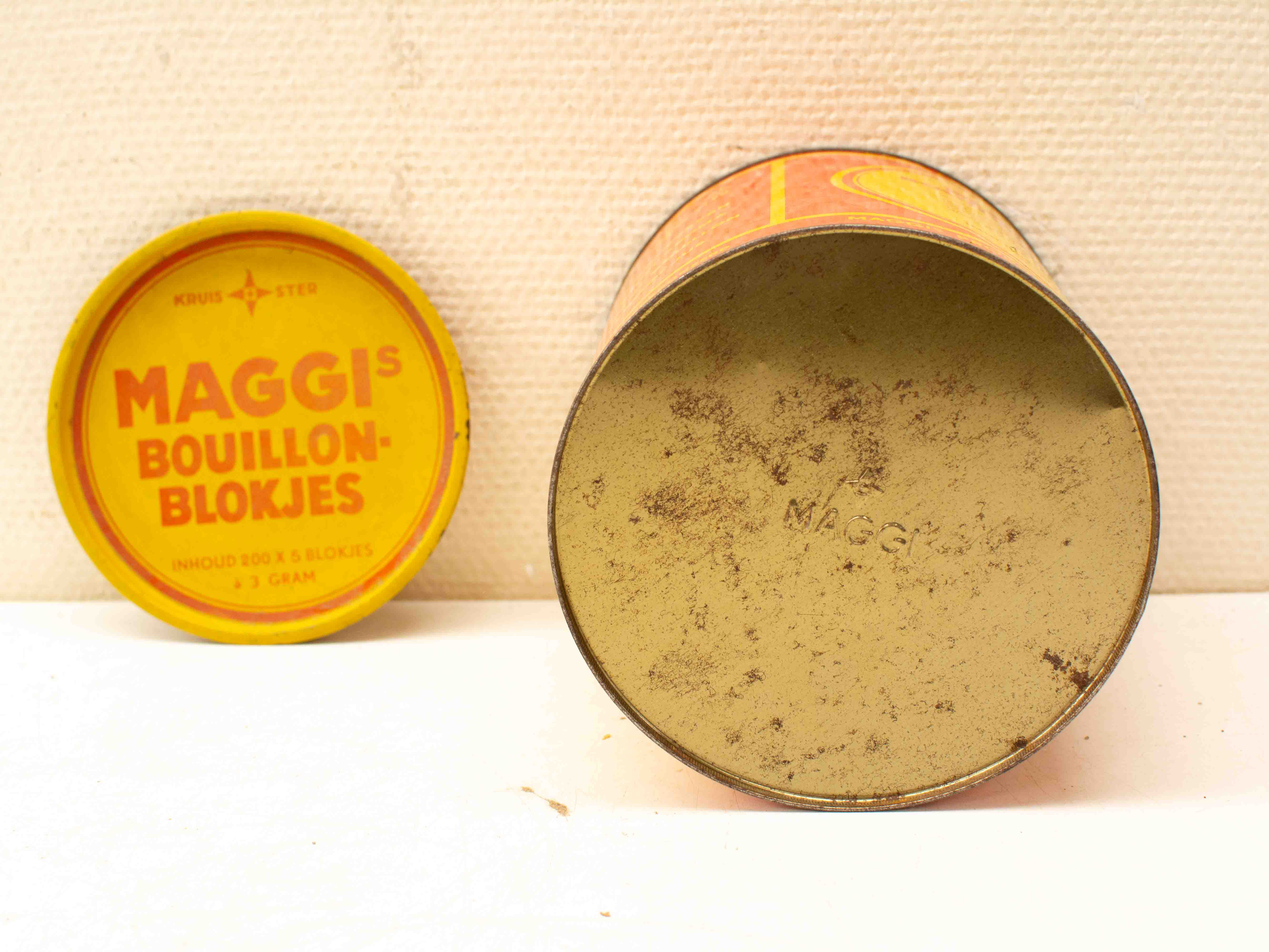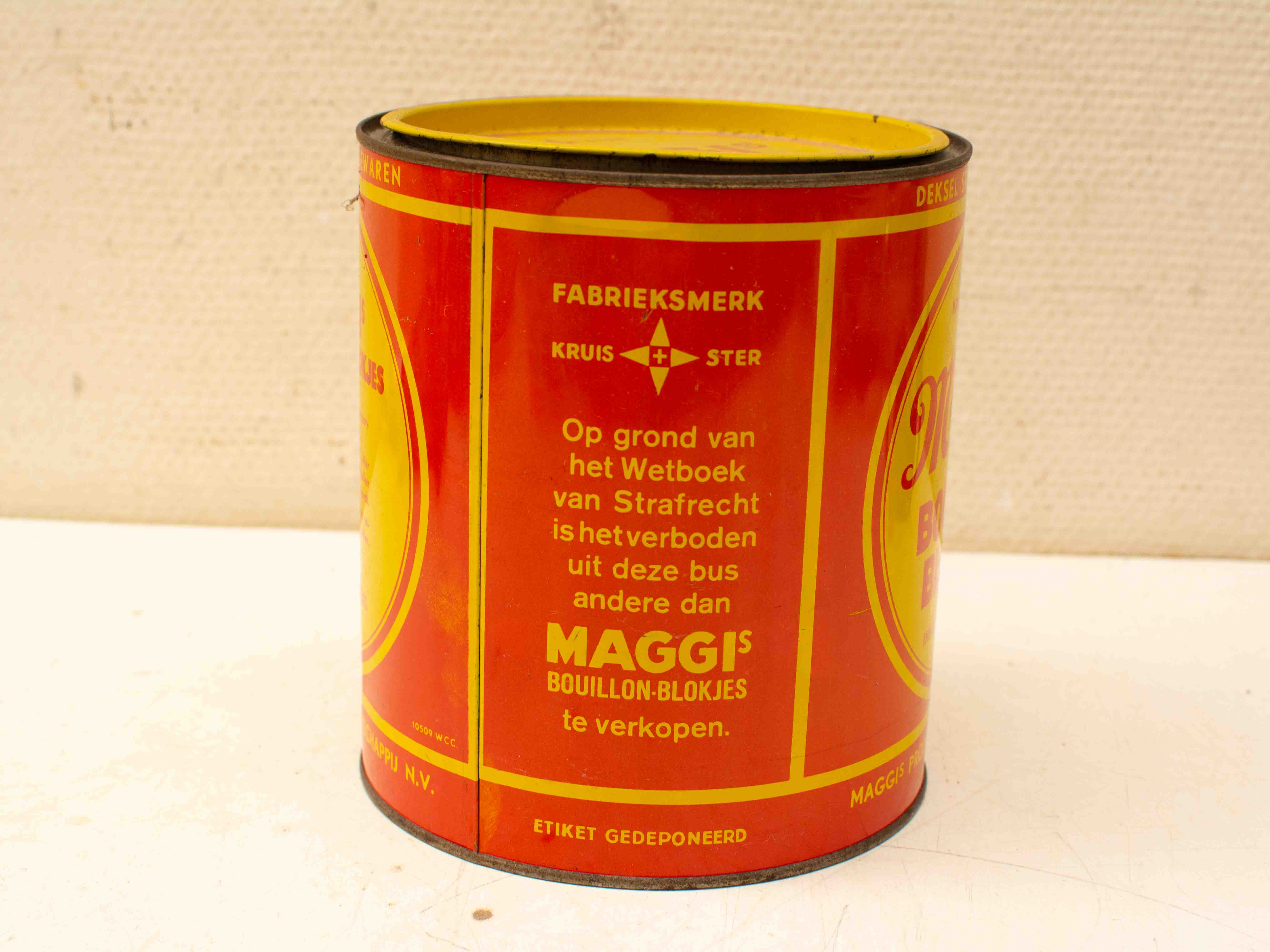 de bewaarblik is gebruikt en heeft gebruikssporen roestplekjes aan de binnenen buitenkant diameter bovenkant gemeten met rand 17 cm hoog 19,5 cm