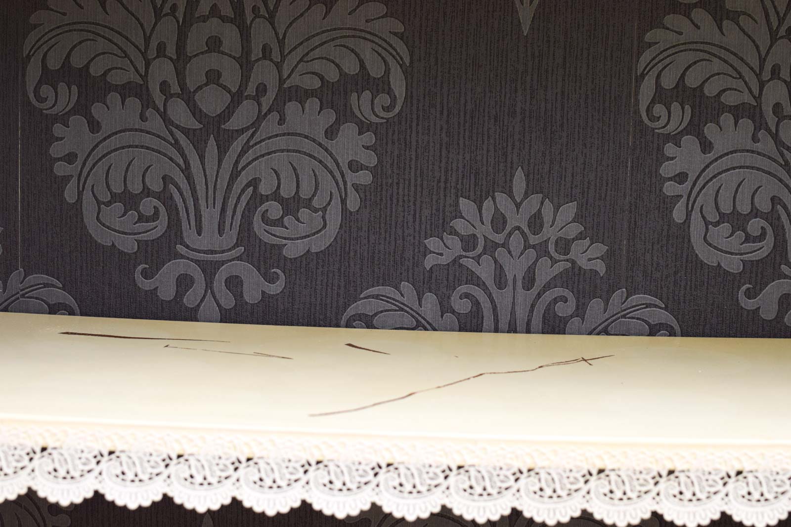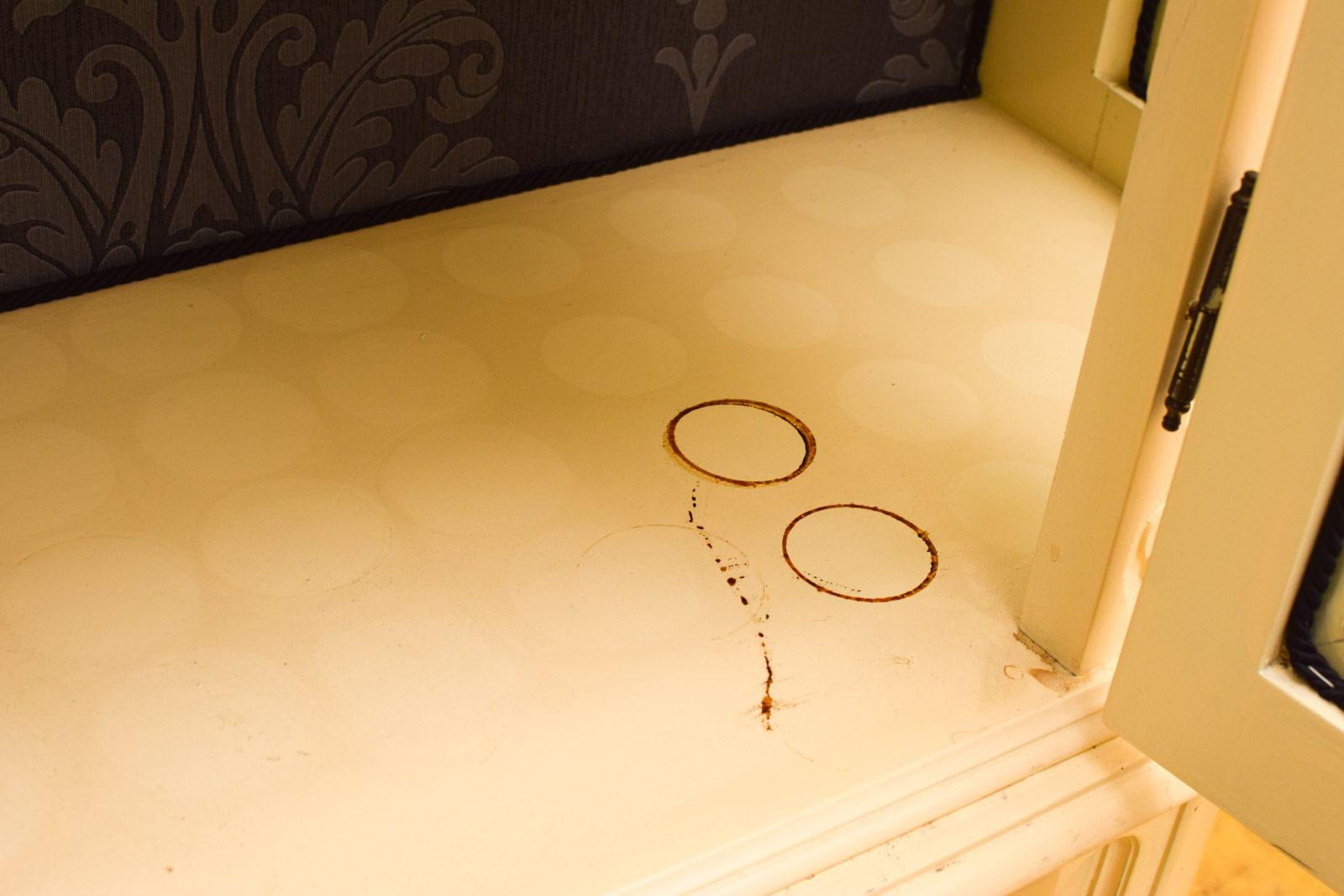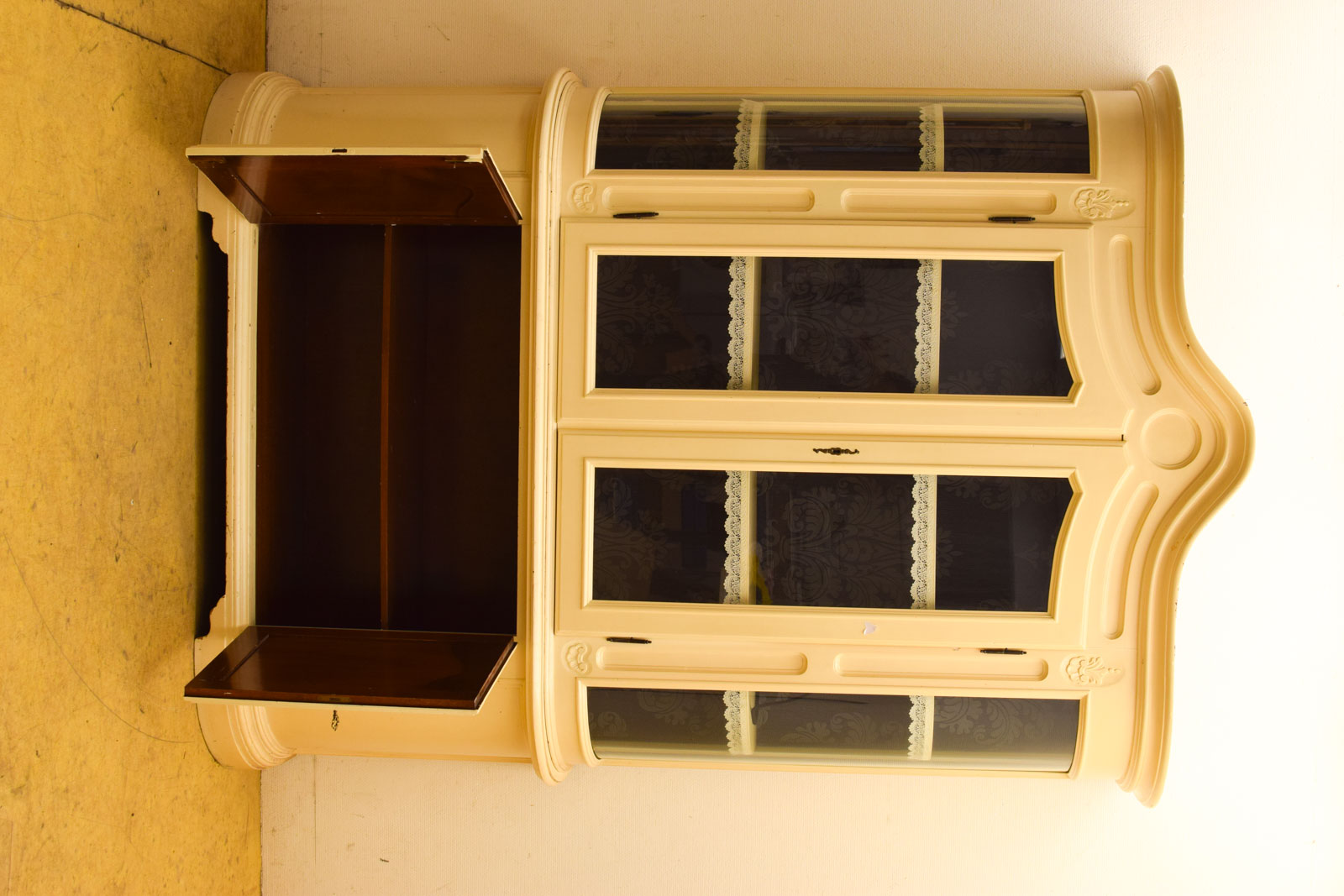 Statige creme vitrinekast met hoog glas en twee deuren. Hoogte 218 cm, breedte 150 cm. Glas heel, wel gebruikssporen en wat beschadigingen. Inclusief sleutel.