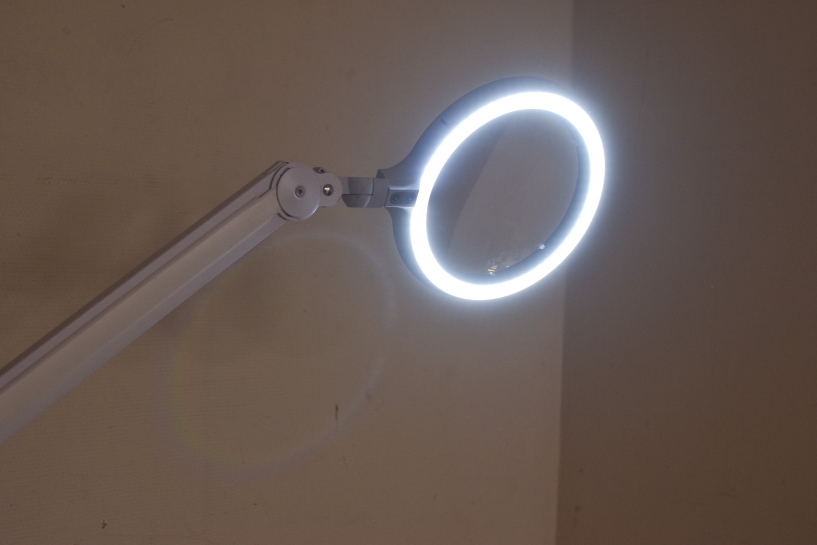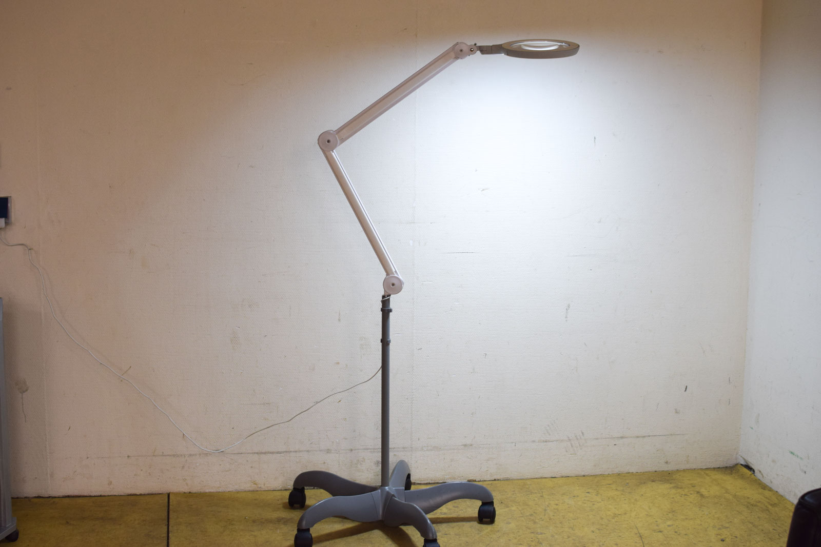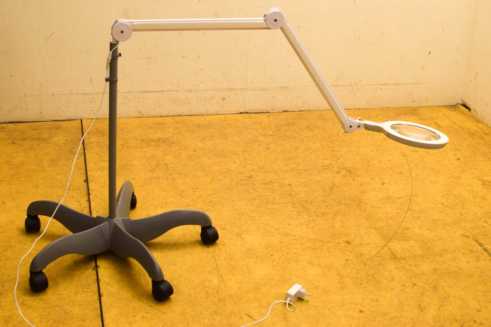 makkelijk verrijdbaar door de wieltjes de hals is buigzaam de loeplamp heeft licht die je kan verstellen de vloer led lamp is gebruikt en heeft gebruikssporen helemaal gemeten hoogte 163 cm laagste stand 40 cm