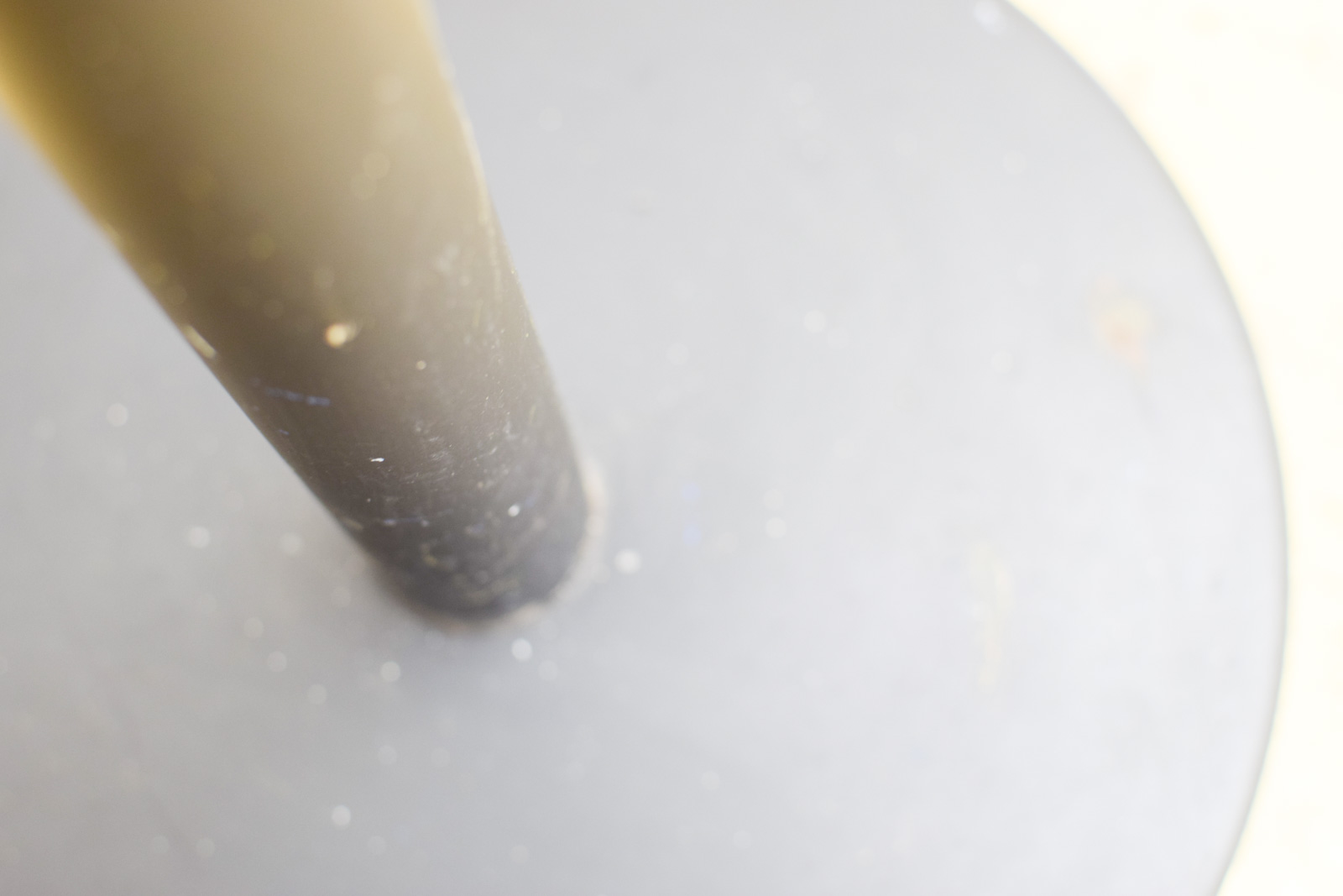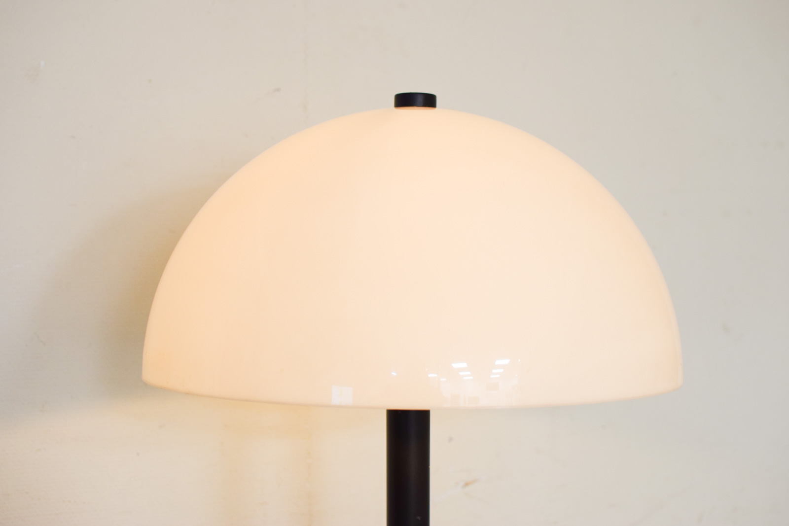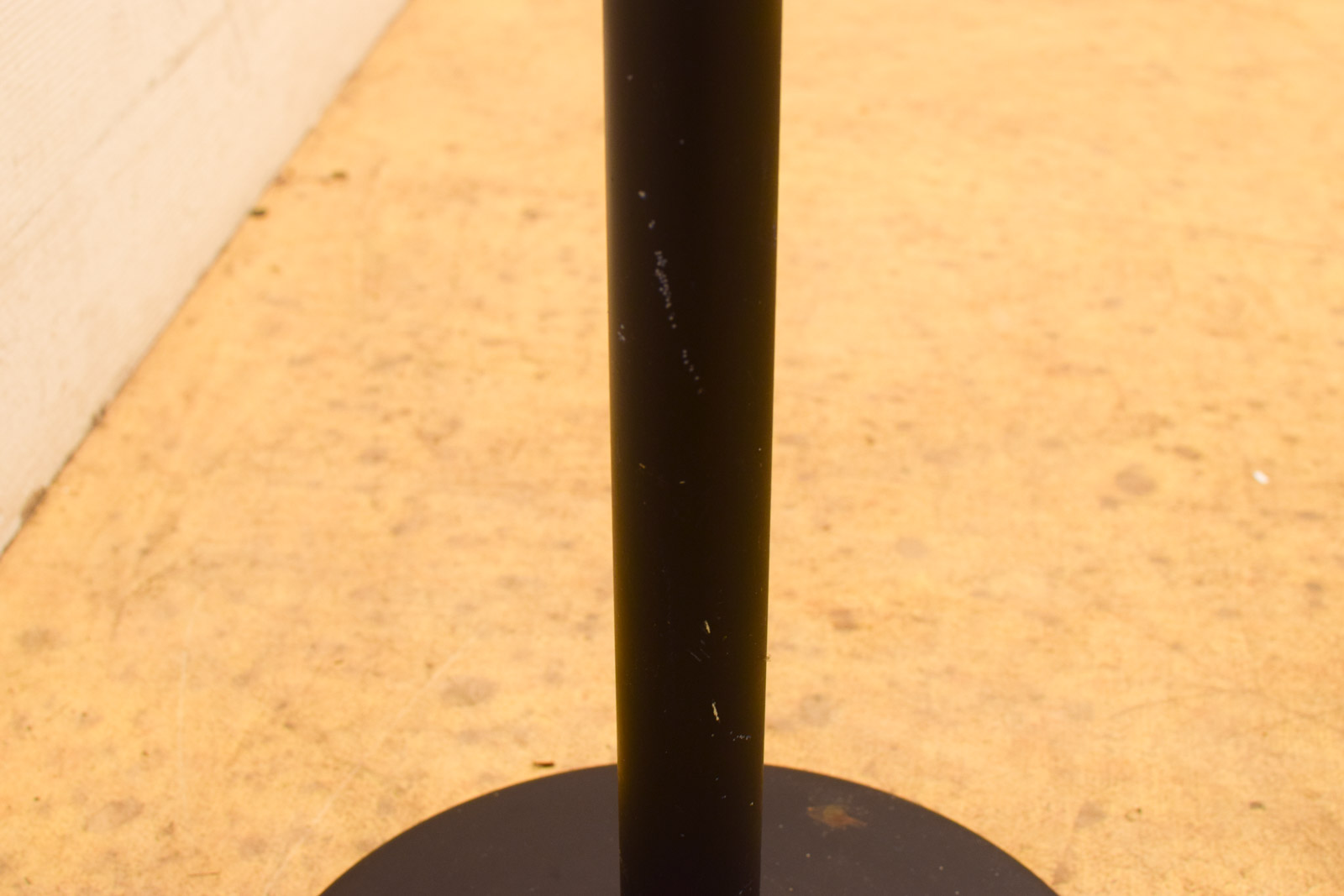 de lampenkap is van plastic diameter onderkant 50 cm en heeft wat vlekken en krassen maar is nog heel de poot en onderstel is van metaal en heeft wat vlekken en roestplekjes ongeveer 150 cm hoog