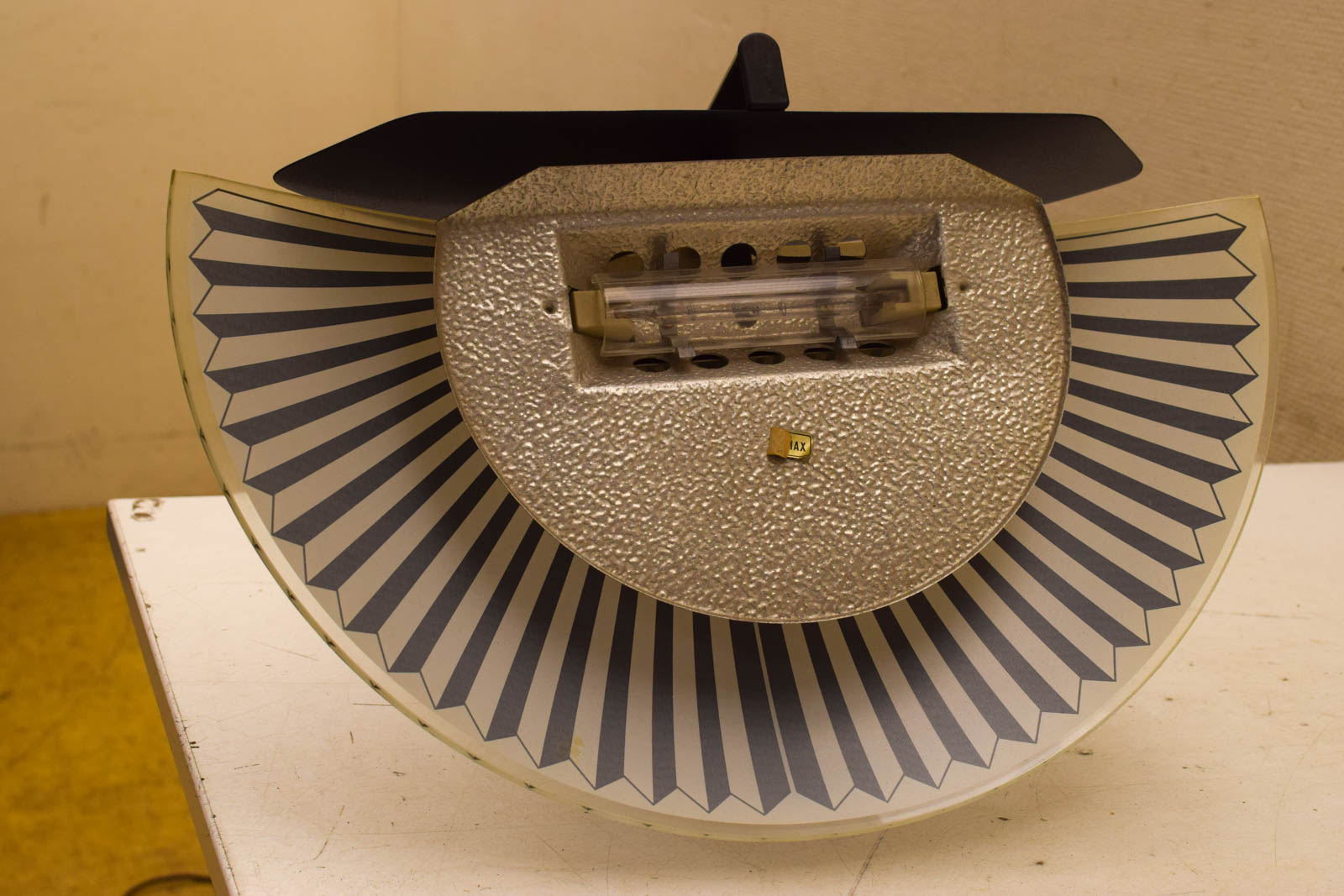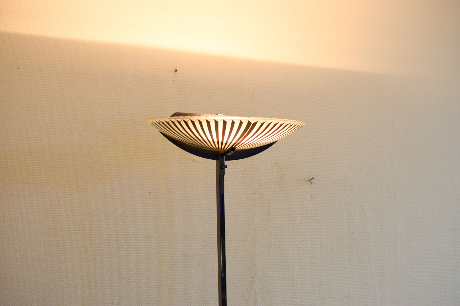 de poot en onderstel zijn van metaal de lampenkap is van glas