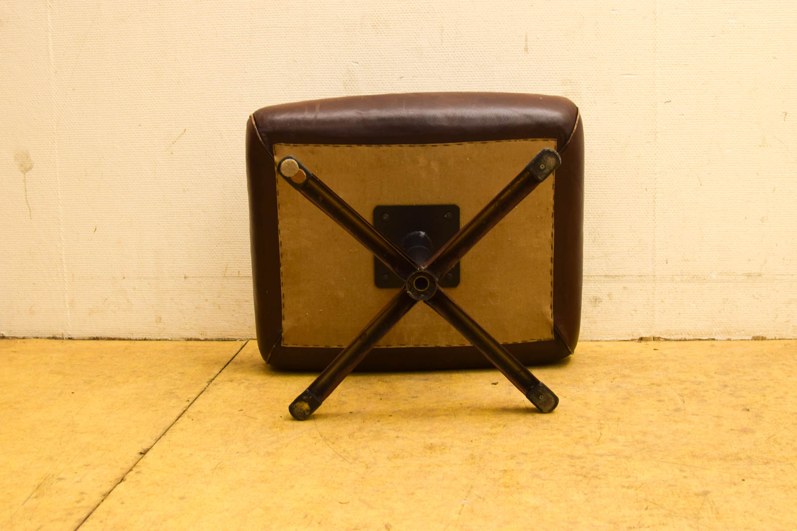 Dit vintage lederen voetenbankje is een praktisch en stijlvol accent voor je huiskamer. De voetenbankje heeft een draaibare zitting die je handmatig kunt roteren, wat extra flexibiliteit geeft bij het inrichten. Het onderstel bestaat uit donkerbruin gelakt hout met een klassiek stervormig design, typisch voor meubelen uit de jaren 70 en 80.