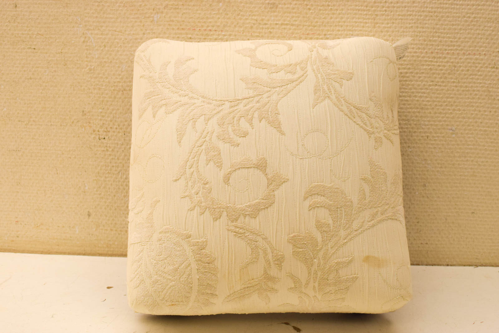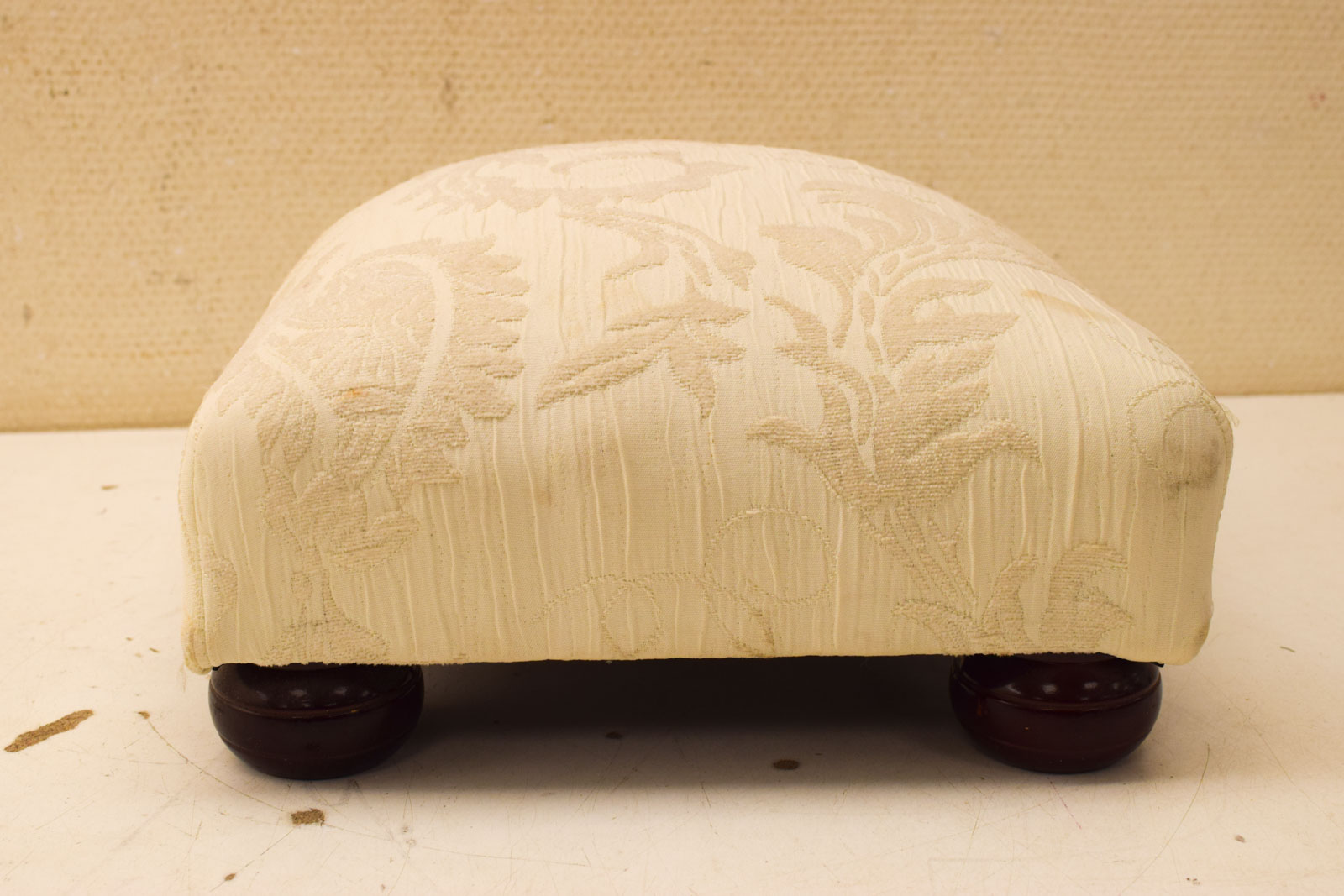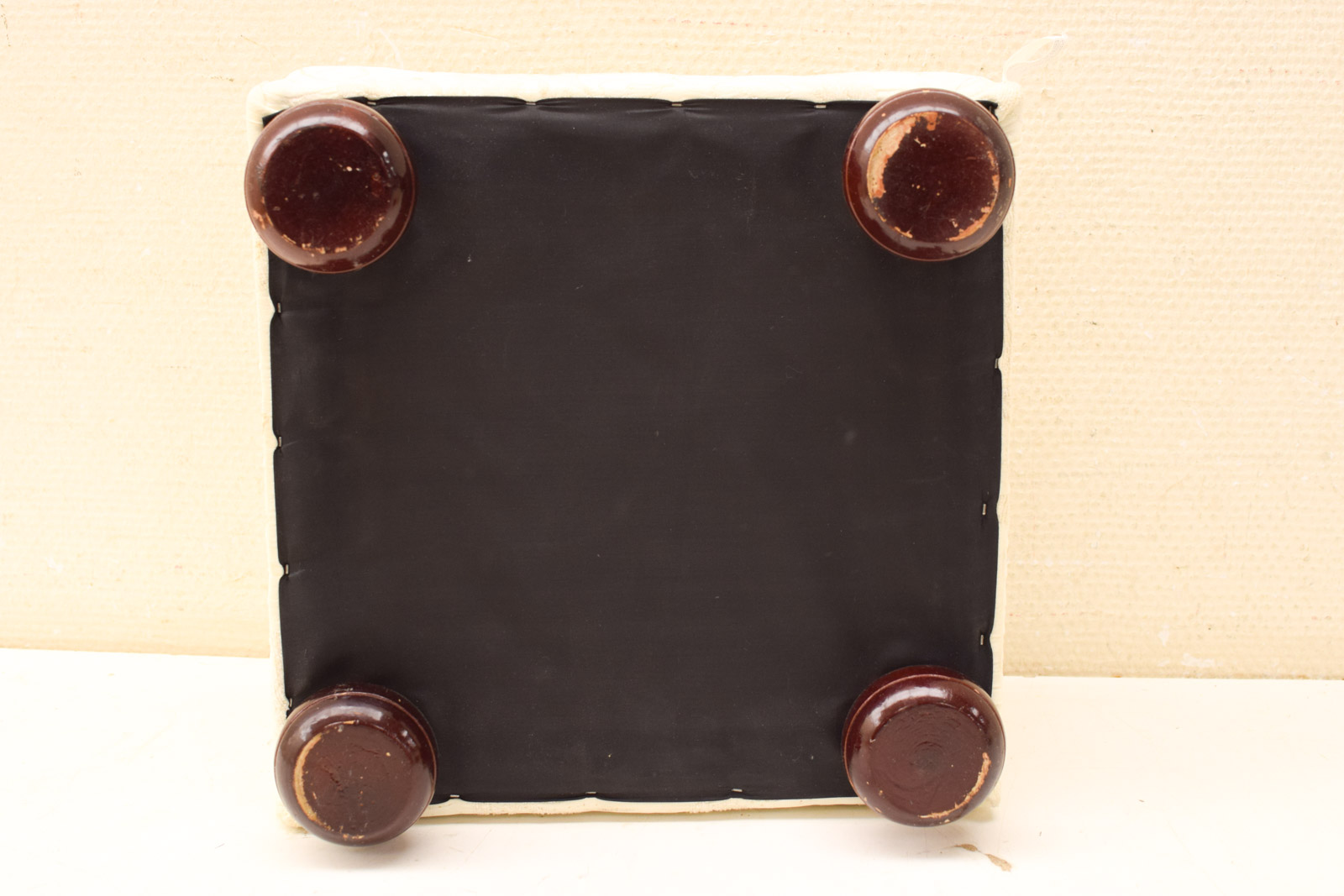het hout heeft slijtage aan de onderkant het stofje is heel maar heeft vlekjes