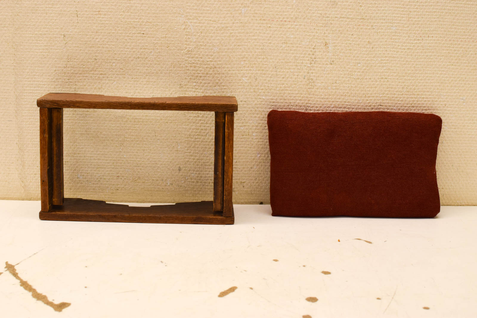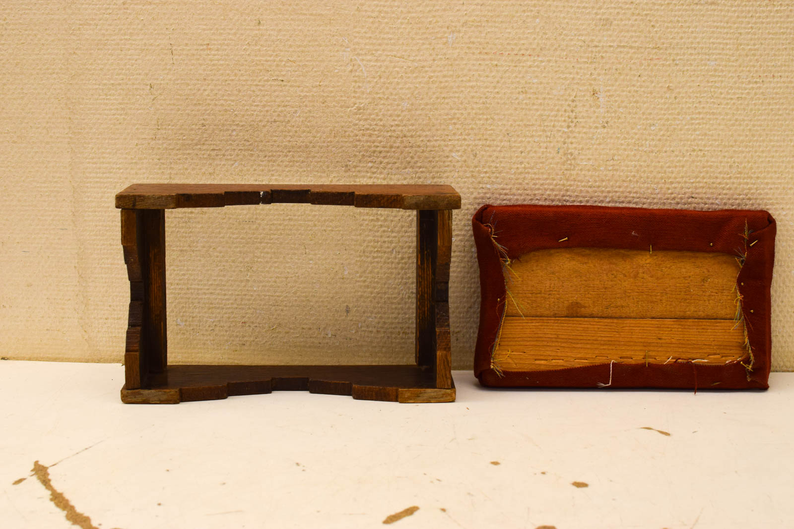 Het kussen is gemaakt van rood wollen stof en ligt losjes op de houten onderkant, zodat je het eraf kunt halen. De houten basis toont duidelijk gebruikssporen en vergeling, maar het is nog stevig en compleet. Dit geeft het stuk karakter en past goed in een vintage of landelijk ingerichte ruimte.