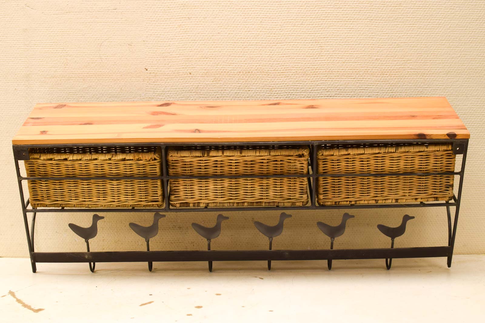 heeft 3 mandjes en 6 haken heeft een houten bovenblad de onderstel is van metaal hoog 31,5 cm breed 20,5 cm