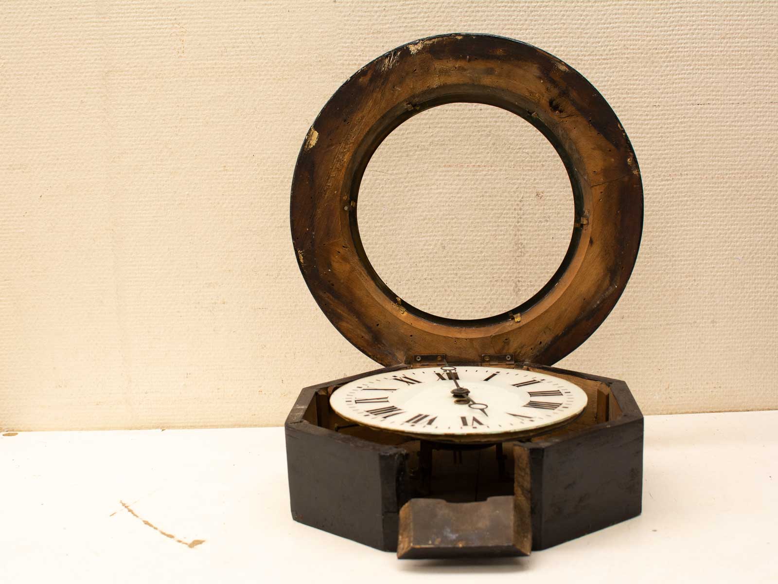 er zit geen glas meer voor er zit geen sleutelbij de klok is loop of sloop diameter voorkant met de hout gemeten 38 cm