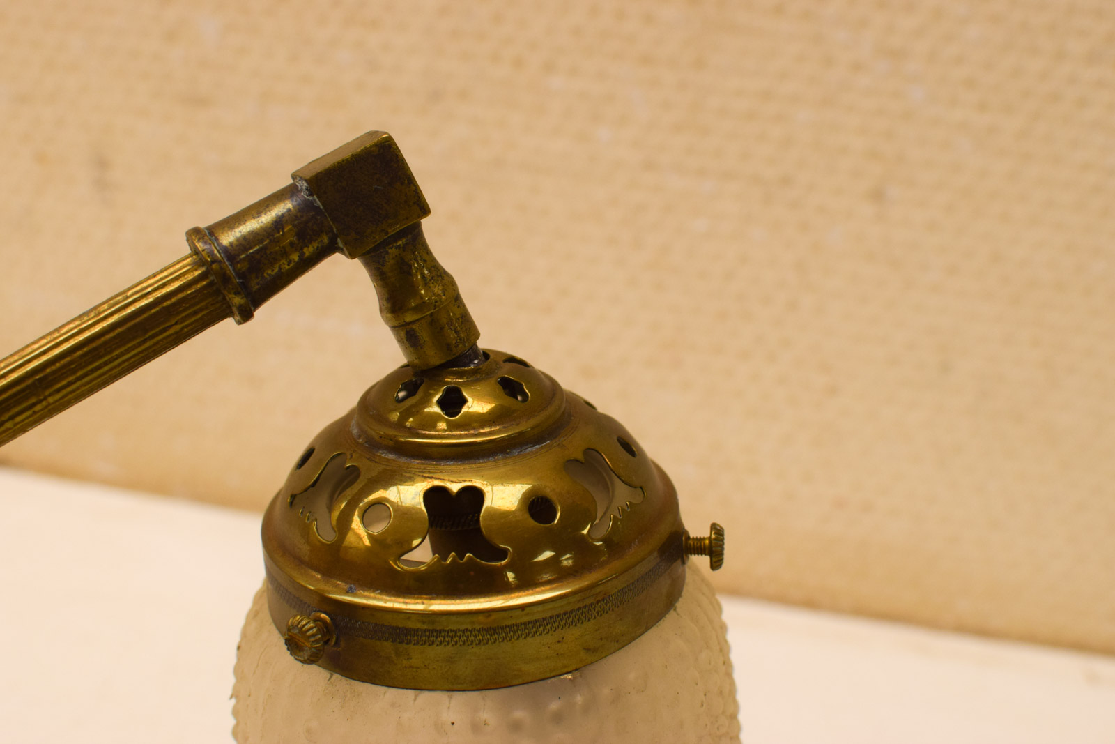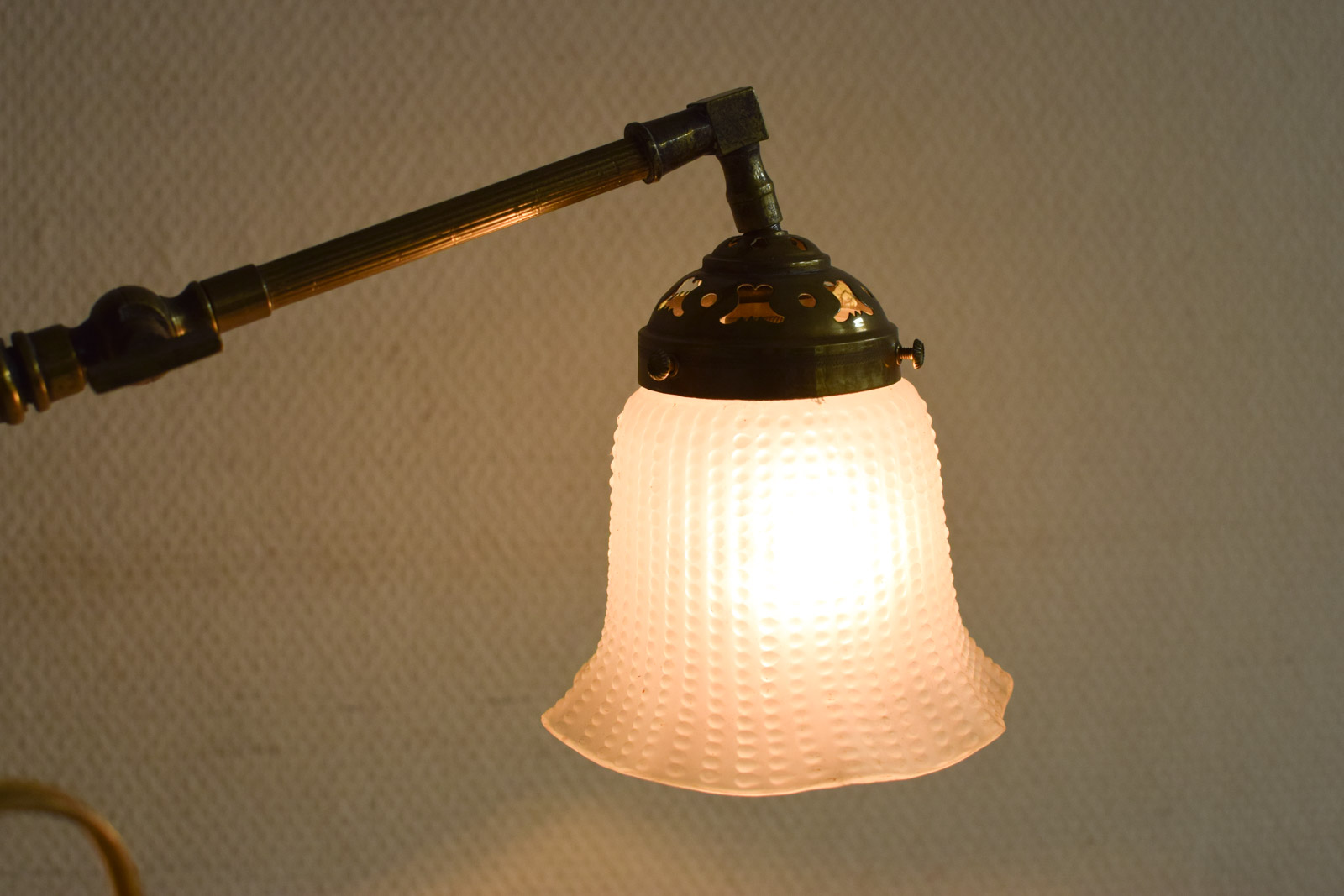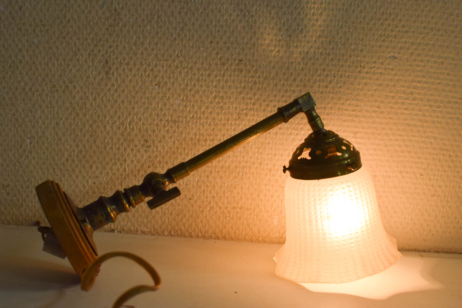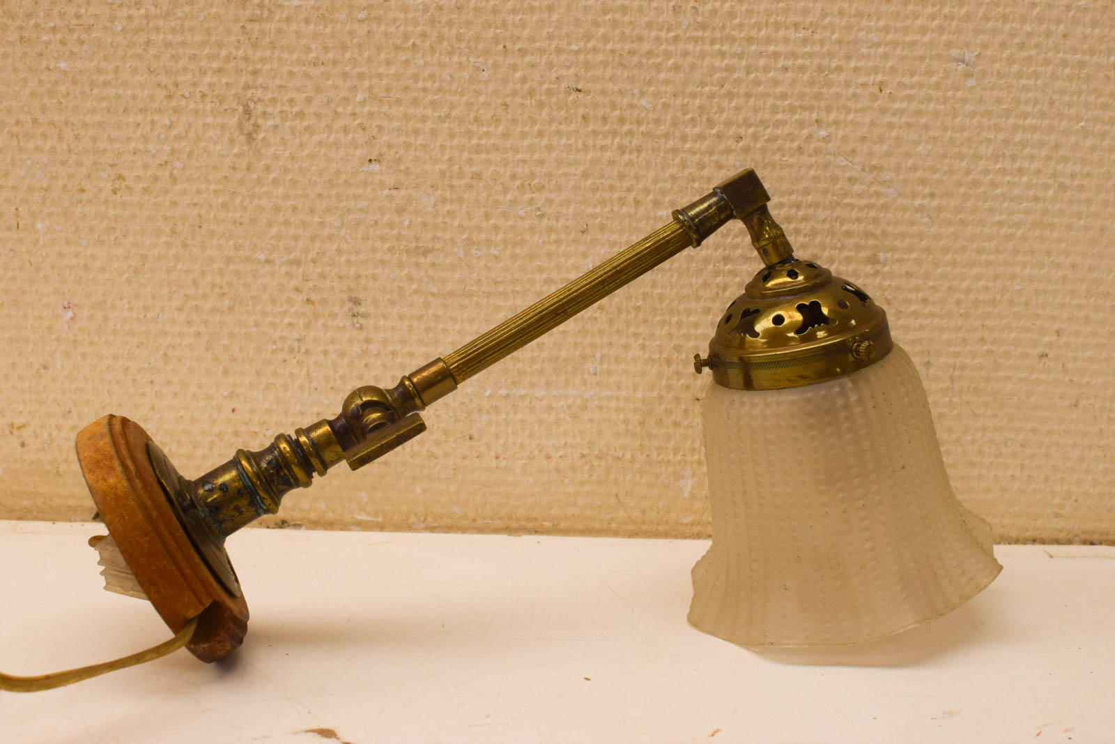 het kapje is een beetje los het muurlampje heeft gebruiksporen het lampenkapje is van glas en nog heel