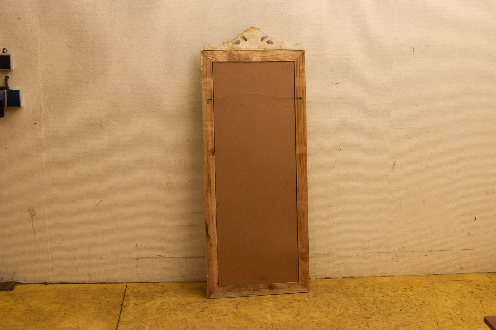 Het houten frame toont gebruikssporen die karakteristiek zijn voor een tweedehandsexemplaar. De spiegel zelf heeft lichte krasjes en een doffe glans in plaats van een glanzend oppervlak. Dit draagt bij aan de vintage uitstraling, zonder het functioneren te belemmeren. De spiegel is geschikt voor gebruik in een hal, slaapkamer of woonkamer waar je wat klassieke flair wilt toevoegen.