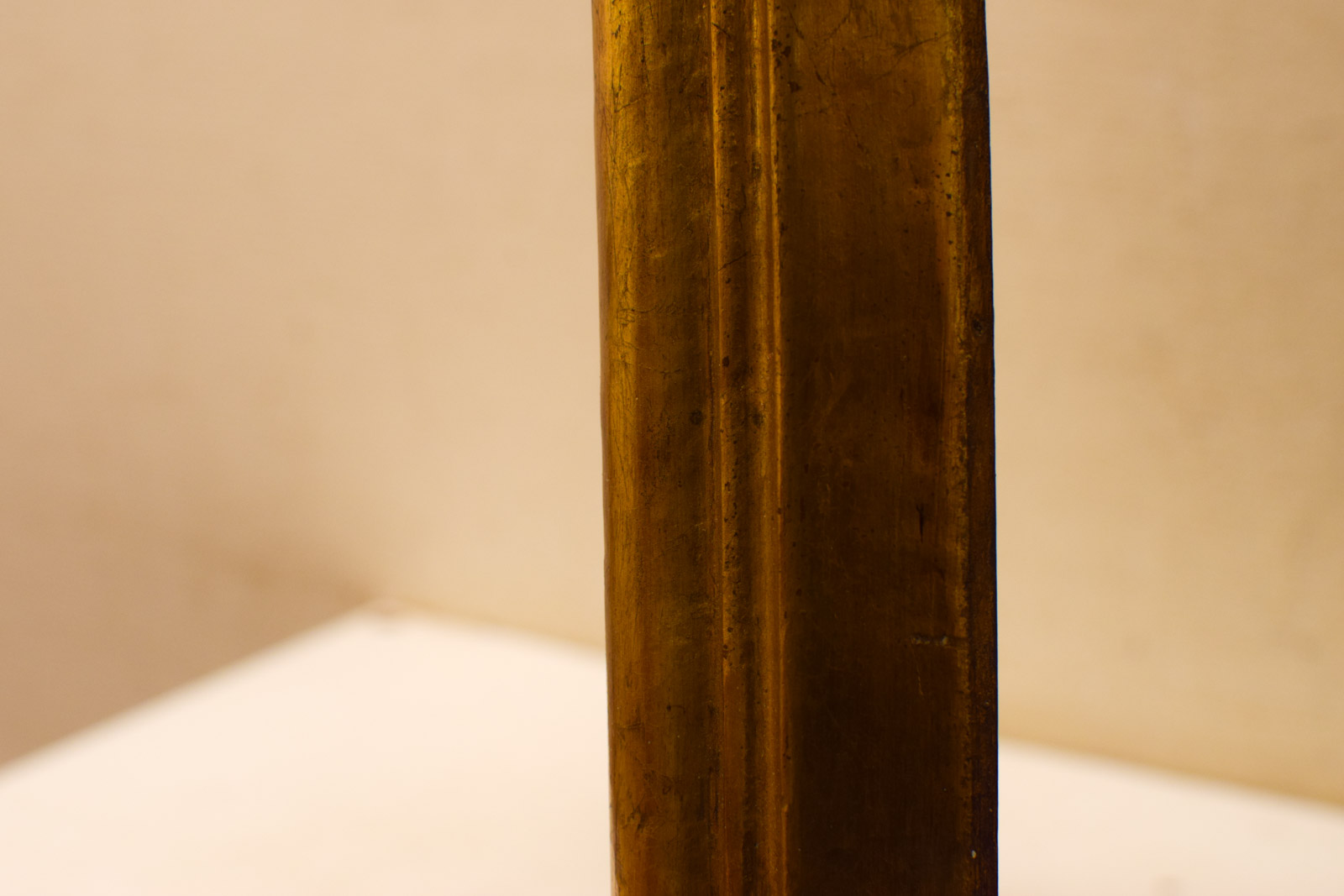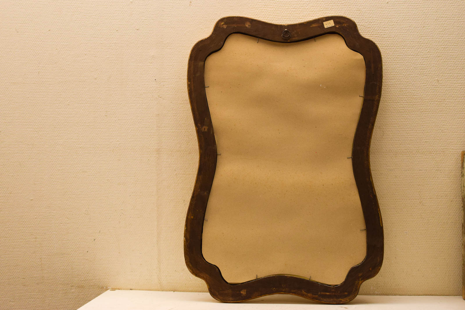 De spiegel zelf is heel en doet zijn werk, al is het spiegeloppervlak dof geworden. Dit gebeurt vaak met oudere spiegels en geeft ze juist een karaktervol, warm uiterlijk. De houten lijst heeft zichtbare gebruikssporen en patina op de goudkleurige verflaag, wat past bij de authenticiteit van een tweedehandsexemplaar.