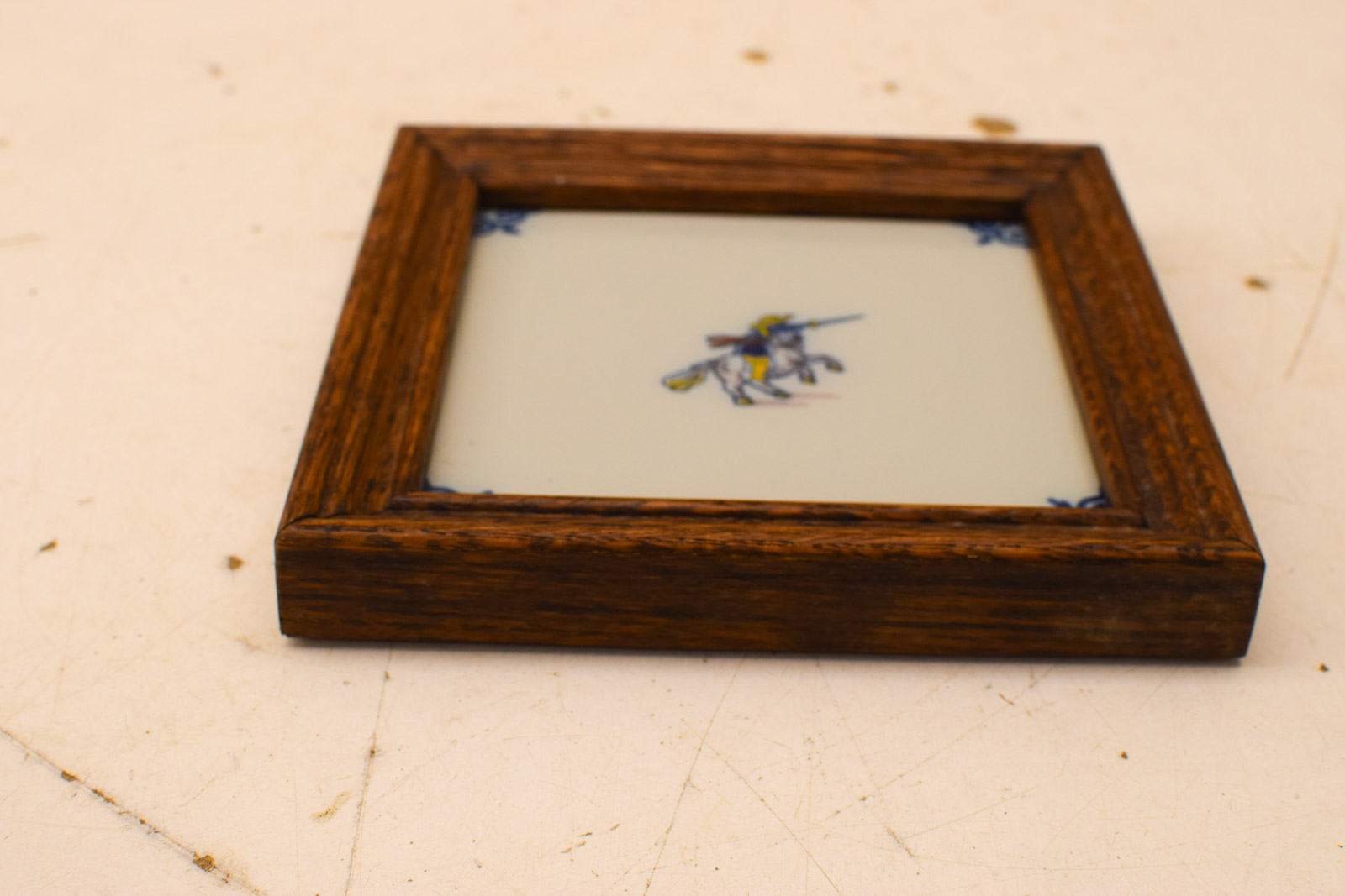 Wandtegel in houten lijstje met prent van een man met zijn zwaard op zijn paard 50599