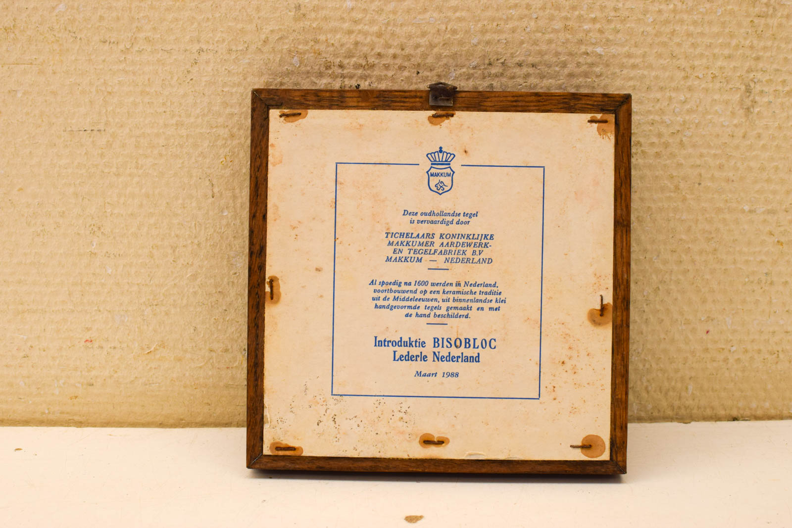 Vintage wandtegel in houten lijstje met handgeschilderde prent van een ridder op paard. Uit 1988 van Makkum, afmetingen 16,5 x 16,5 cm. Leuk retro woonaccessoire met gebruikssporen.