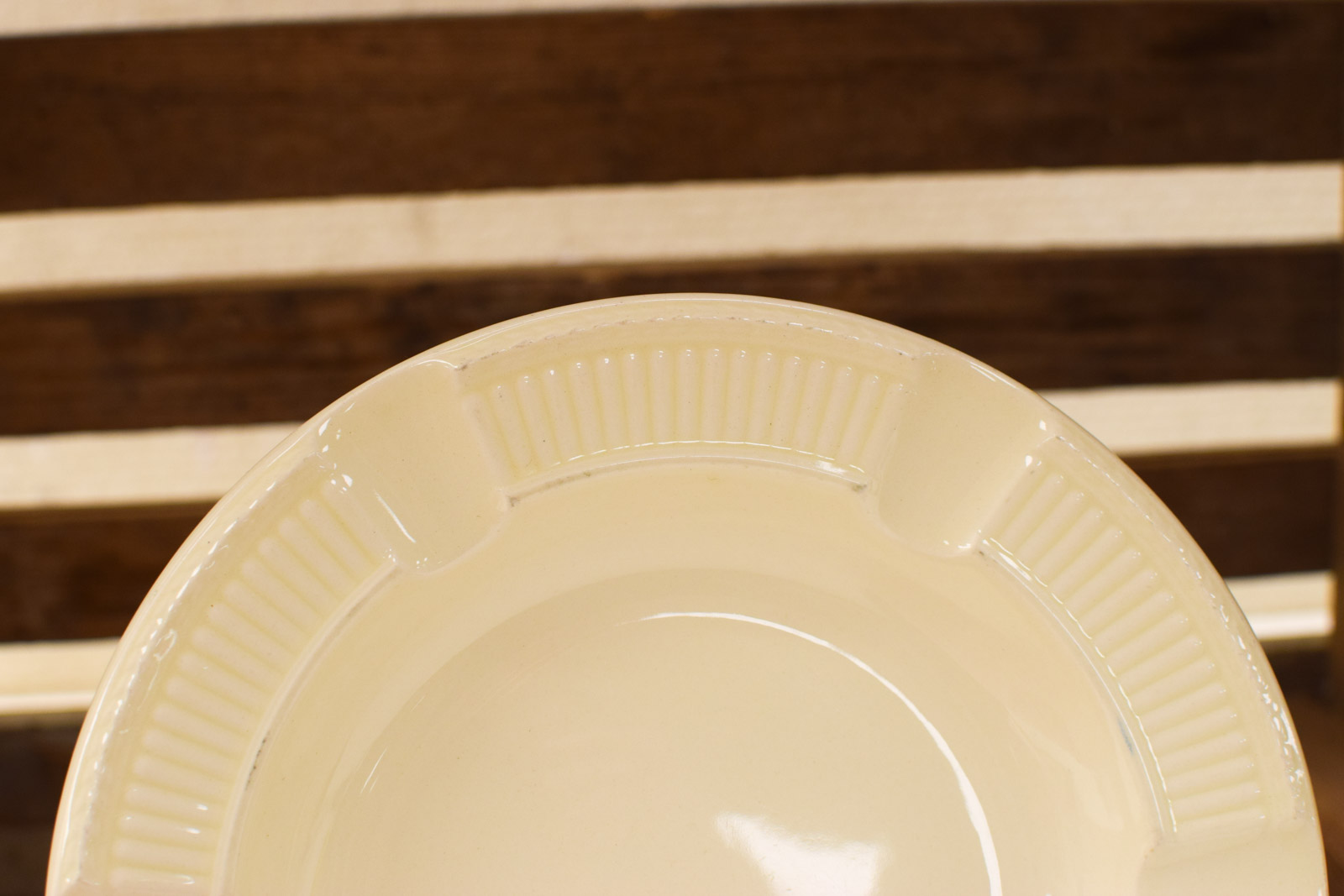 Dit is een Wedgwood porseleinen asbak, model 50905. Het stuk heeft het karakteristieke geribbelde randpatroon dat Wedgwood typeerde in hun klassieke serviesgoed. De asbak meet 17,5 cm in beide richtingen en 2,5 cm hoog, dus stevig genoeg om goed ter hand te liggen.