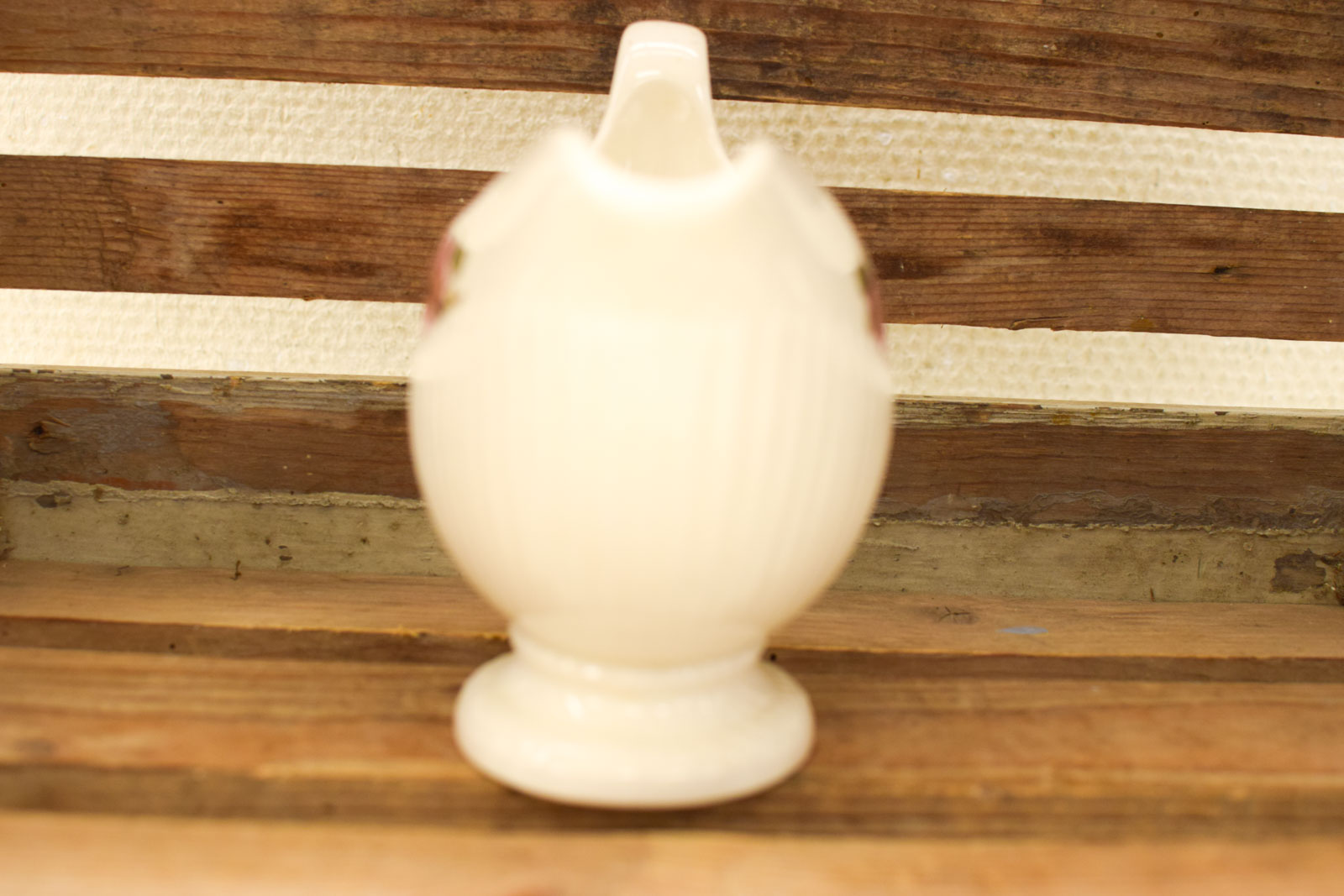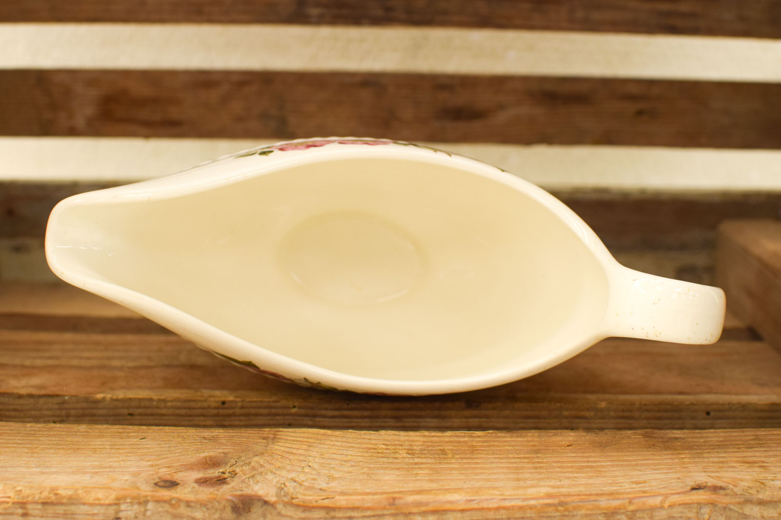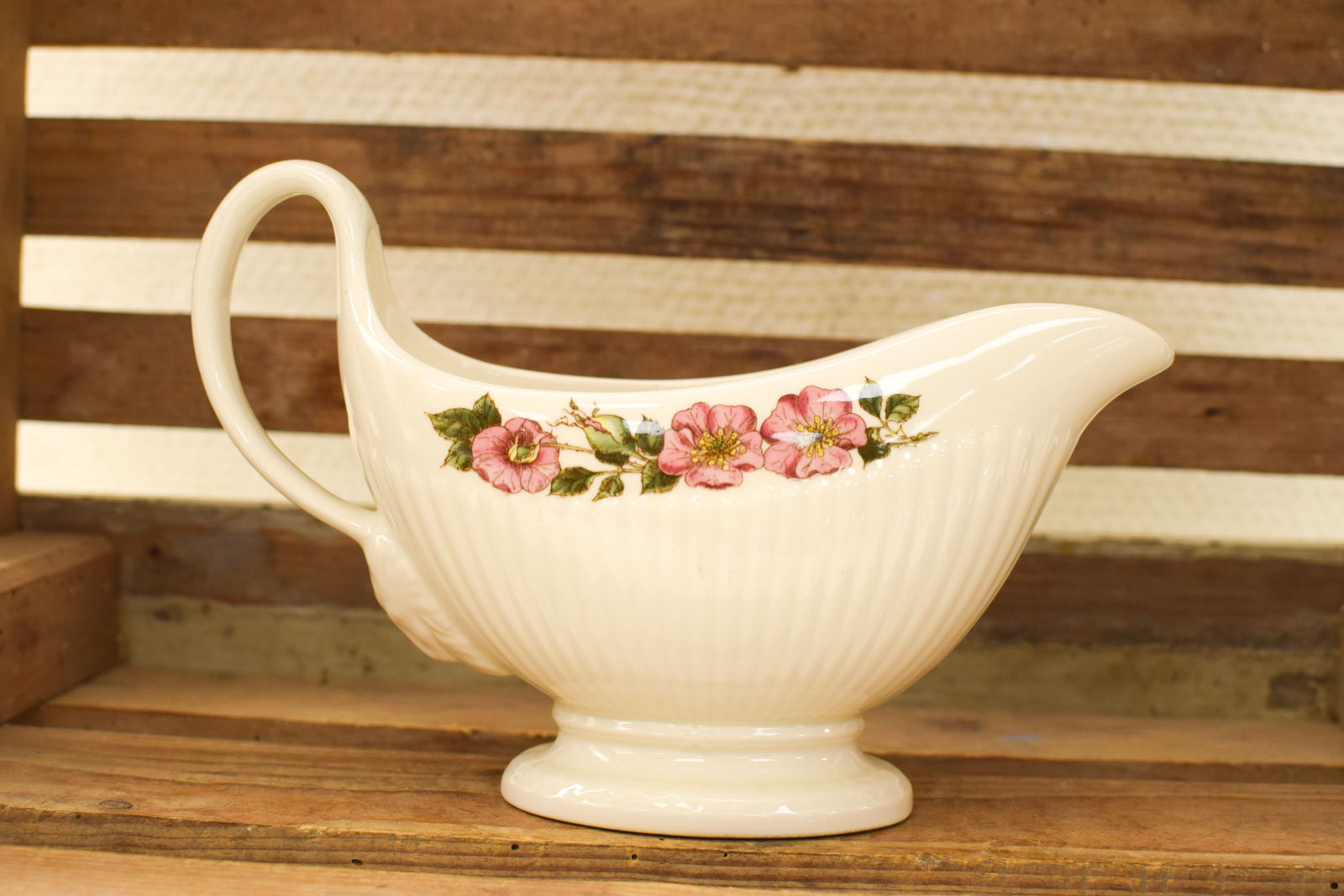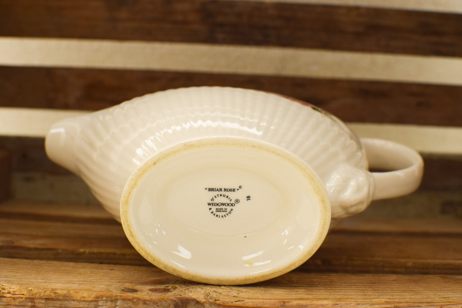 Dit Wedgwood porseleinen jus schaaltje hoort bij de geliefde Briar Rose collectie van Wedgwood. Het schaaltje heeft de kenmerkende pedestal vorm met een tuit en oor, waardoor het gemakkelijk in te gießen en vast te pakken is. De decoratie bestaat uit zacht roze bloemen met groene bladeren op crèmekleurige ondergrond, een klassieke Wedgwood-signatuur.