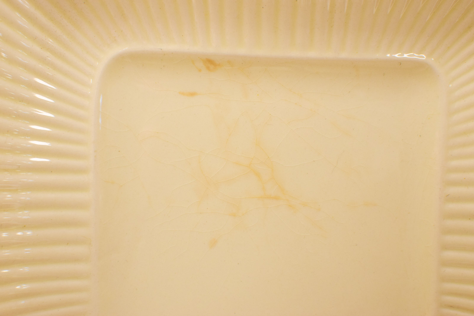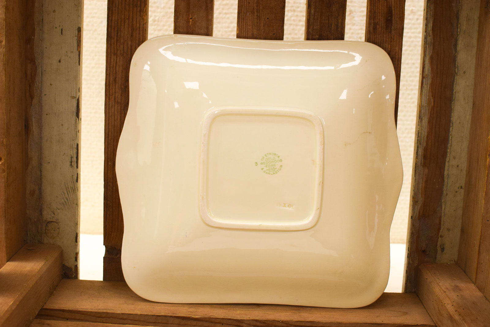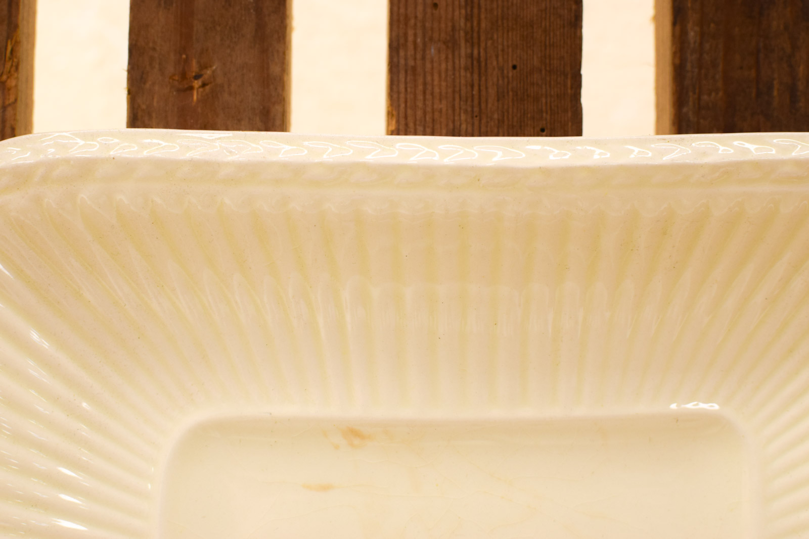 Deze Wedgwood porseleinen schaal is een mooi voorbeeld van klassiek Engels servies. De schaal heeft een rechthoekig formaat met afgeronde hoeken en een opvallende geribde rand die typisch is voor Wedgwood-producten. Met afmetingen van 22,5 bij 24,5 centimeter en een hoogte van 3 centimeter is het een handige tussenmaaltijd- of dessertschaal.