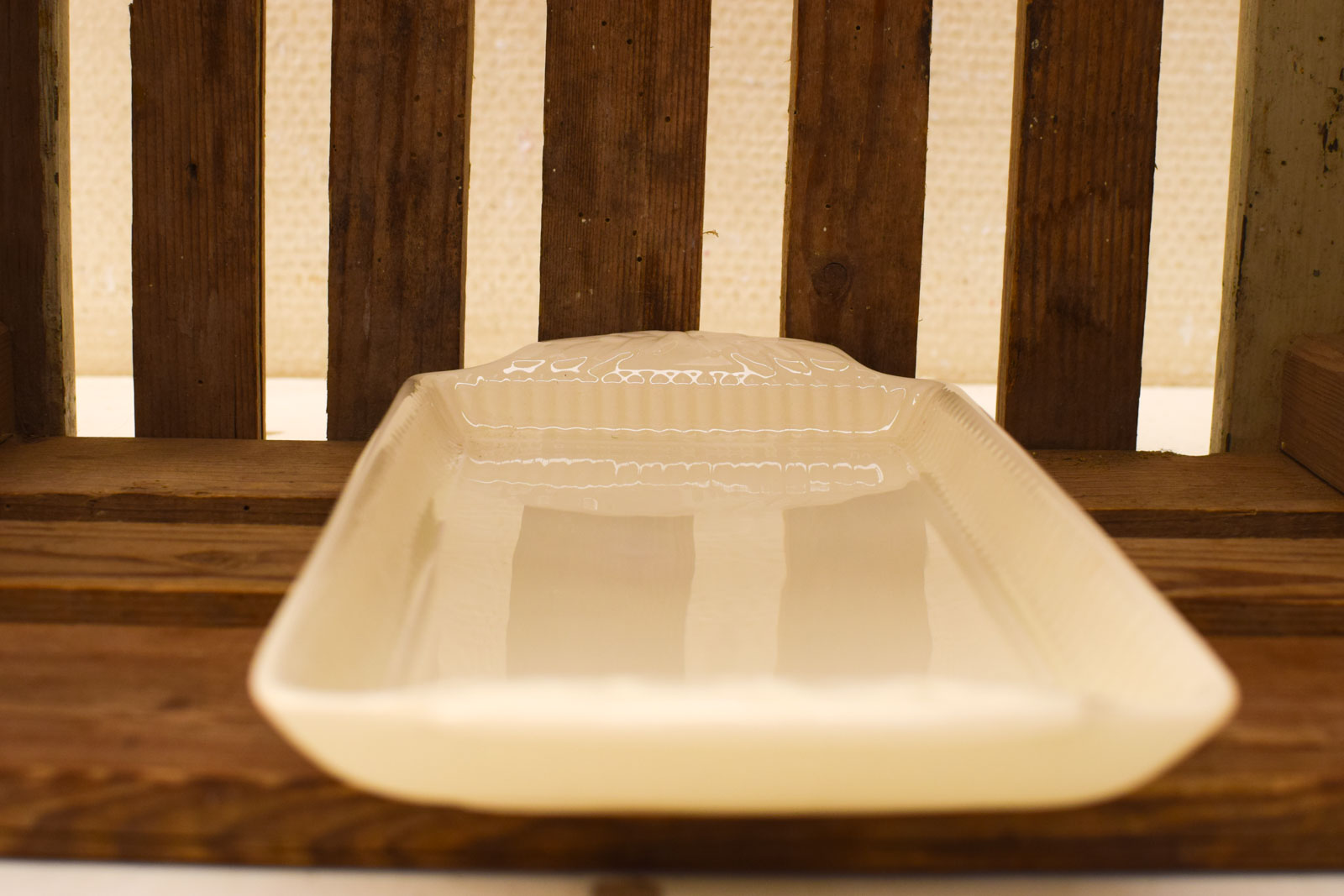 Het schaaltje toont lichte krasjes die typerend zijn voor porselen dat in gebruik is geweest, maar dit beperkt de bruikbaarheid niet. De crèmekleurige afwerking en de elegante vorm met afgeronde hoeken geven het stuk een klassieke uitstraling die bij veel interieurs aansluit.