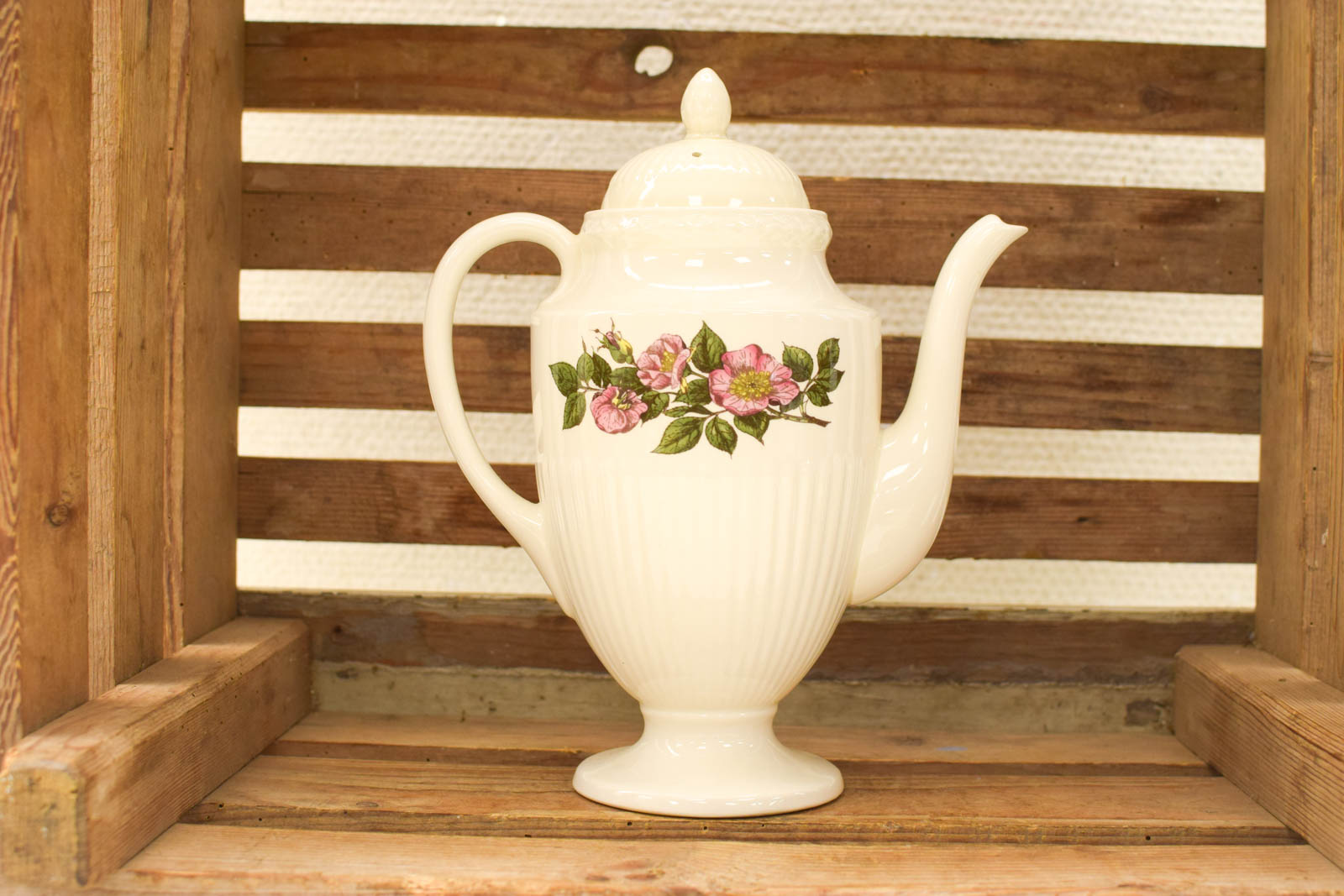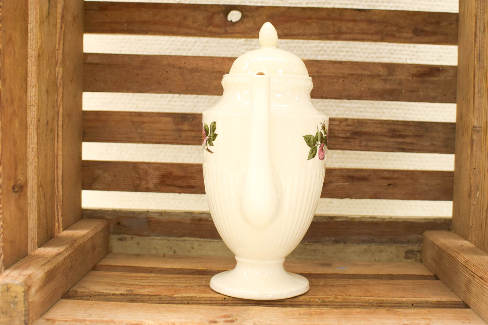 Deze Wedgwood theepot is een mooi voorbeeld van klassiek Engels porselein. Het witte servies is versierd met een roze rozendecoratief motief op de buik, een kenmerkend detail van de Briar Rose-collectie. De theepot heeft de typische elegante vorm met gebogen tuit, twee oren aan de zijkanten en een ronde dekseltop, wat kenmerkend is voor traditioneel Engels servies uit de twintigste eeuw.