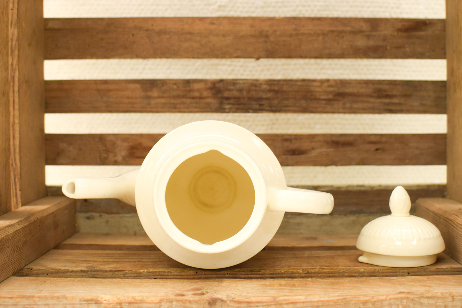 De staat van deze theepot is redelijk goed. Aan de binnenzijde zit lichte aanslag, hetgeen niet ongewoon is voor vintage servies dat regelmatig is gebruikt. De buitenkant en decoratie zijn goed bewaard gebleven. Afmetingen: gemeten van tuit tot oor is de breedte 18,5 cm, en zonder deksel is de hoogte 19 cm. Dit is een praktische maat voor het zetten van 4 tot 6 kopjes thee.