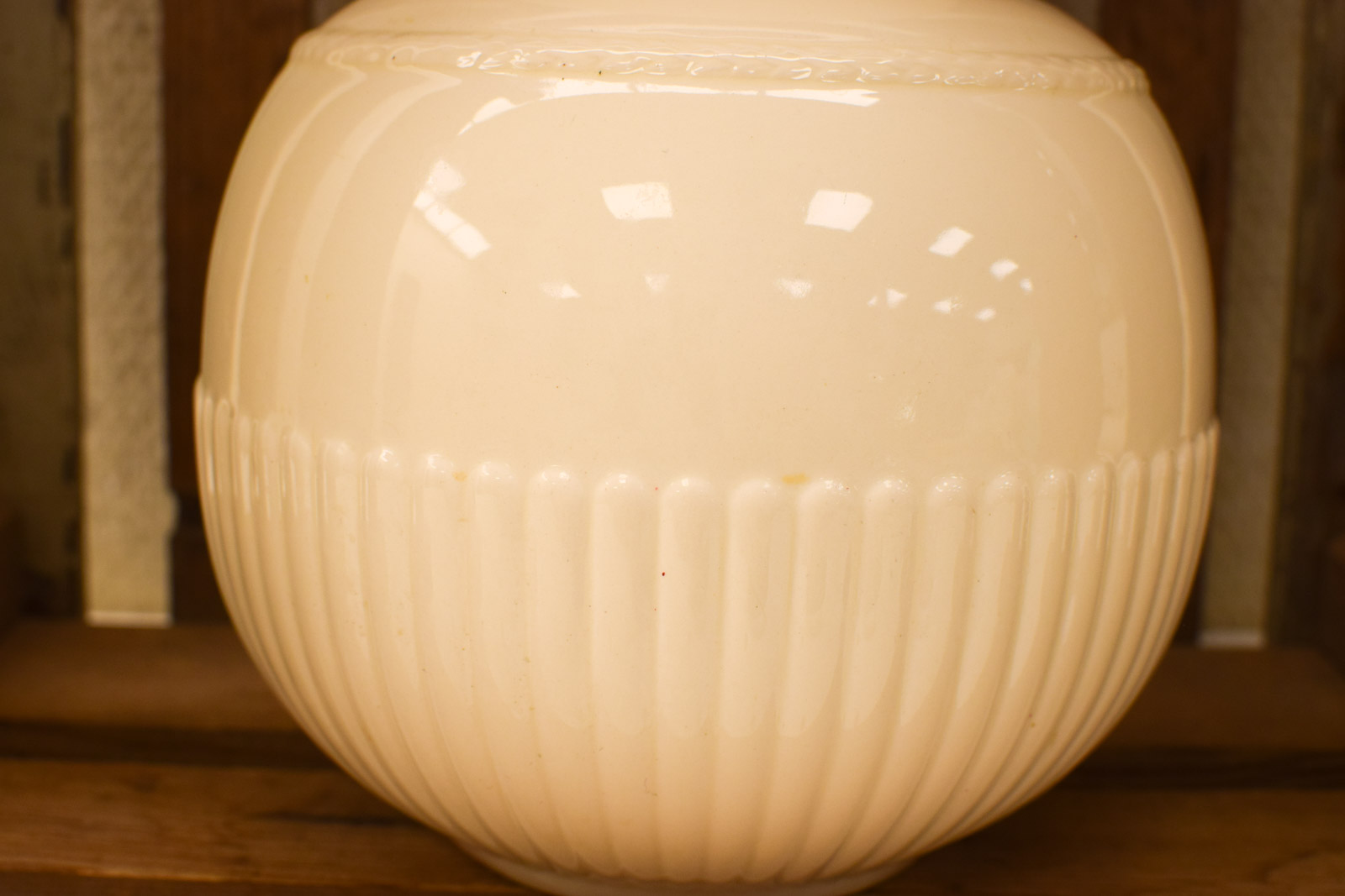 Dit is een Wedgwood porseleinen vaas, een klassieke Engelse vaas uit de Queen’s Ware collectie. De vaas is gemaakt van fijn porselein in een creme kleur met een verfijnd verticaal geribbeld motief in de onderste helft. Met een hoogte van 18,5 cm en een diameteropening van 11 cm aan de bovenkant heeft deze Wedgwood porseleinen vaas een elegante, compact formaat dat goed uitkomt in verschillende interieurs.