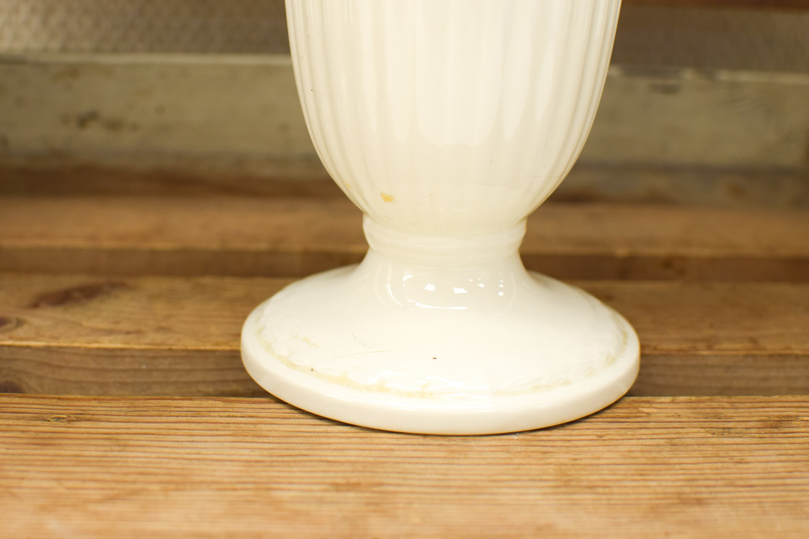 Staat: De vaas vertoont normale gebruikssporen voor zijn leeftijd. Op de onderzijde en zijkanten zie je lichte vlekken en verkleuring. Het porselein zelf is intact, zonder breuken of scheuren. De vaas is volledig bruikbaar als bloemen- of decoratieve vaas.