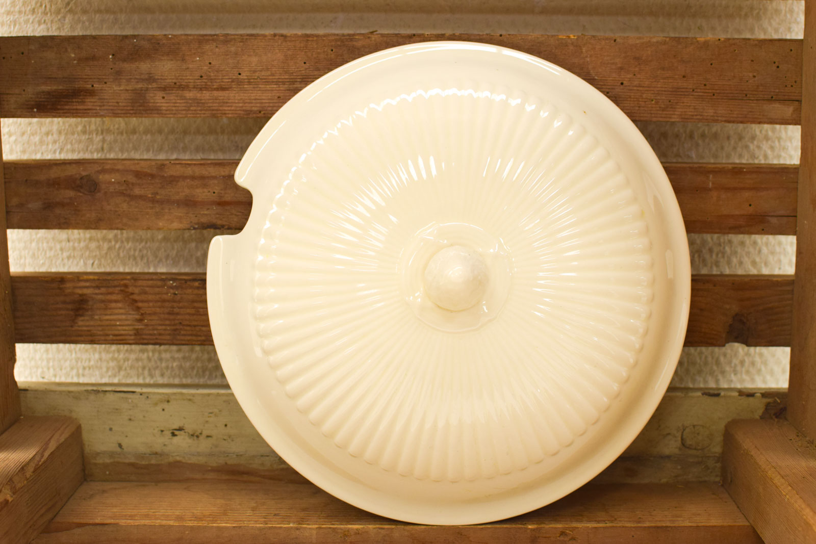 De staat: de schaal vertoont lichte krasjes aan de binnenkant, wat normaal is voor vintage serviesgoed. De deksel en lepel bevinden zich in goede toestand. Het geheel ziet er nog netjes uit en is prima bruikbaar voor gebruik of als decoratief element in de keuken.