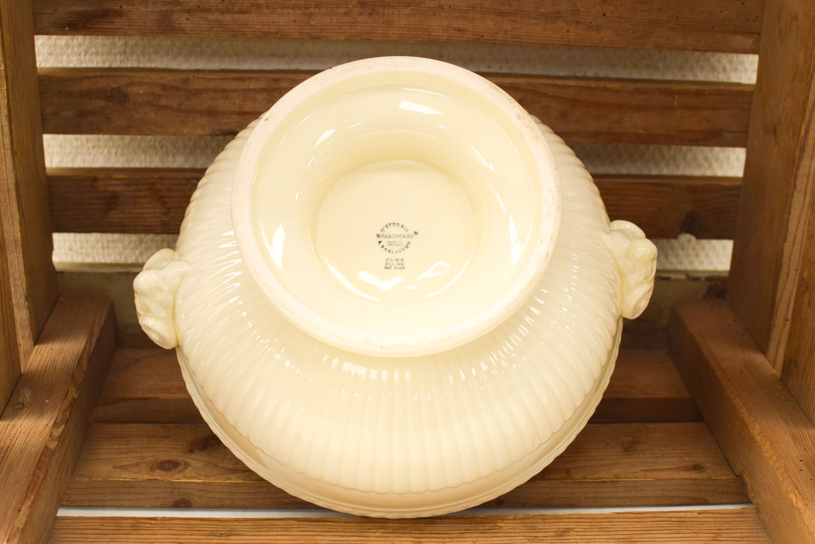 Deze Wedgwood soepterine is een klassiek serviesstuk uit de Britse porseleintraditie. Het set bestaat uit een ruime schaal met twee praktische greepjes, een passende deksel met lepeluitsparing en een bijbehorende lepel. De soepterine heeft een warme crèmekleur en is versierd met fijne reliëfdetails rond de wanden, typisch voor het design van Wedgwood.