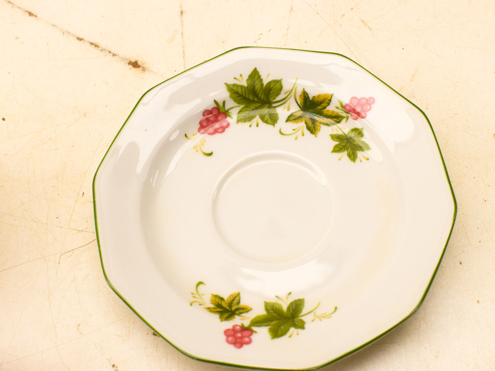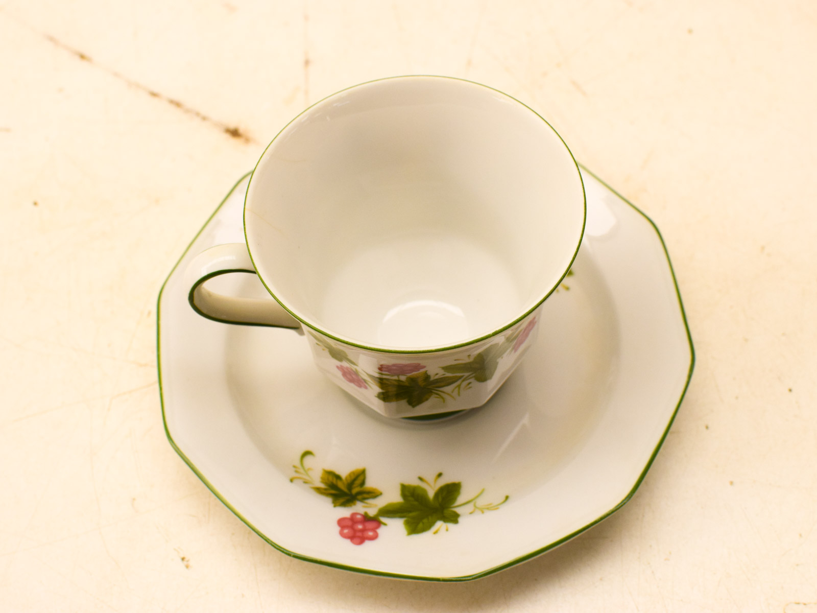 Deze Winterling Bavaria porseleinen kop en schotel stammen uit de Duitse porseleintraditie van Winterling, een producent die bekend staat om verfijnd huisservis met handgeschilderde motieven. Het setje heeft een sierlijke decoratie met rode frambozen en groene blaadjes op een witte ondergrond, afgewerkt met groene randjes.