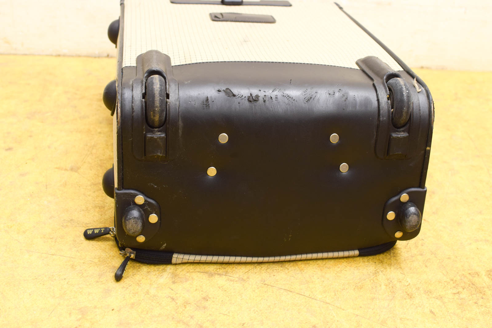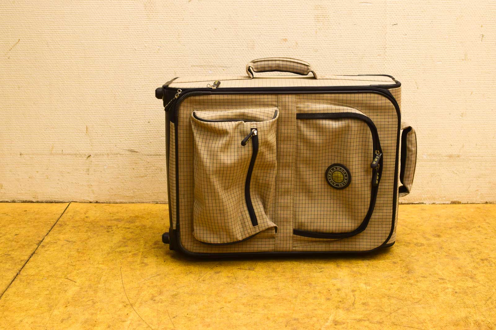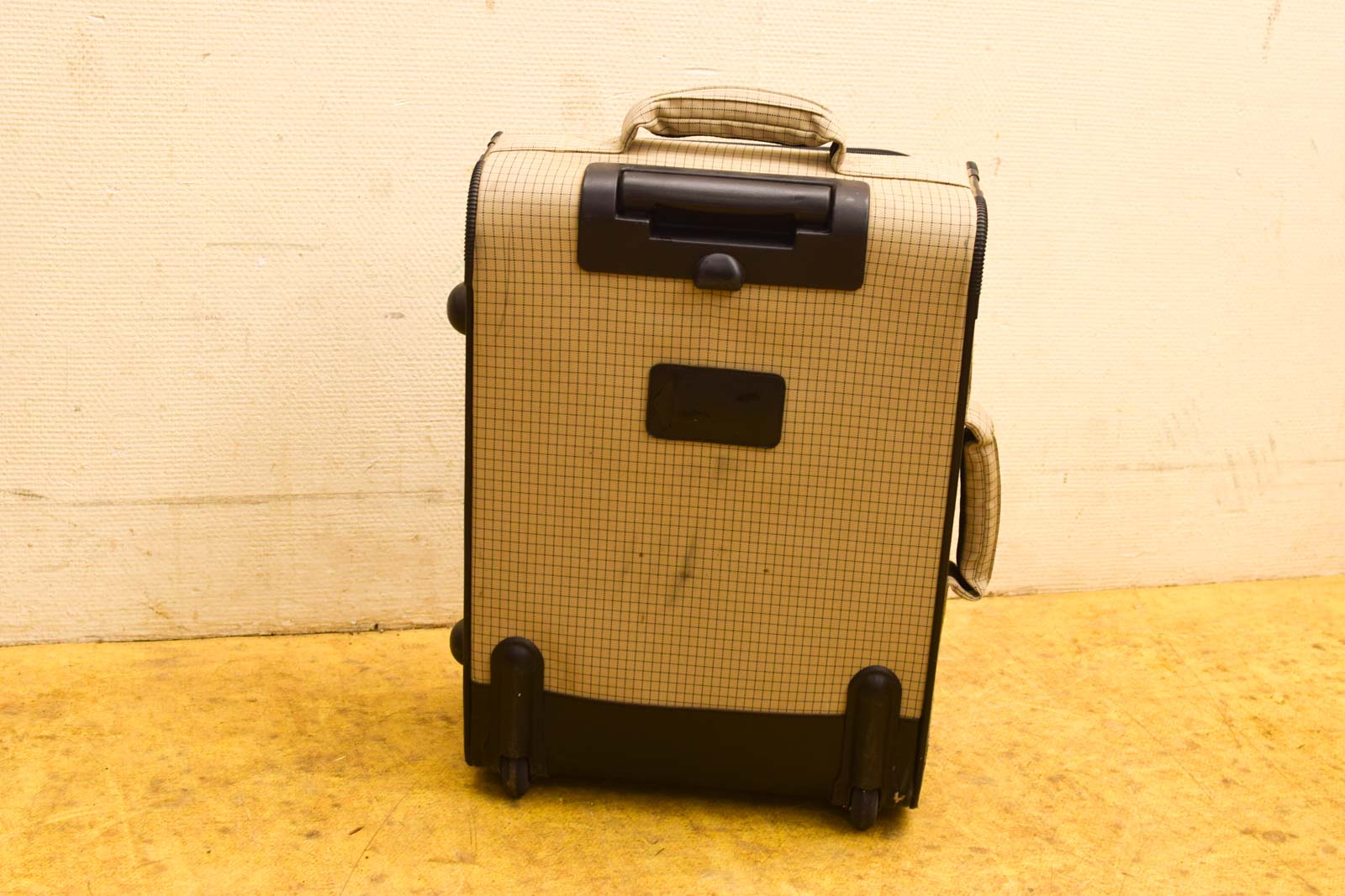 Gemeten met hendel hoog 100 cm heeft 2 wieltjes en noppen aan 1 zijkant de koffer is van stof en heeft vlekken de koffer heeft gebruikssporen