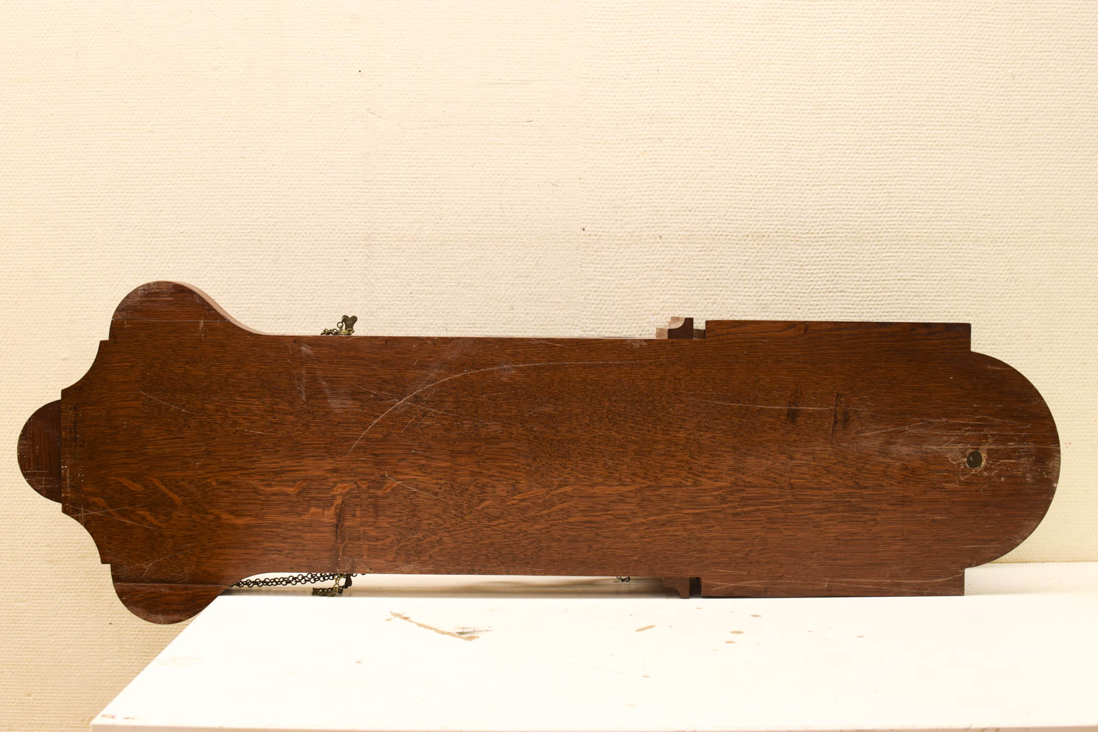 de poppen en gewichten ontbreken de klok is loop of sloop breed 36,5 cm gemeten zonder de kap 123 cm hoog de Friese Staartklok heeft gebruikssporen