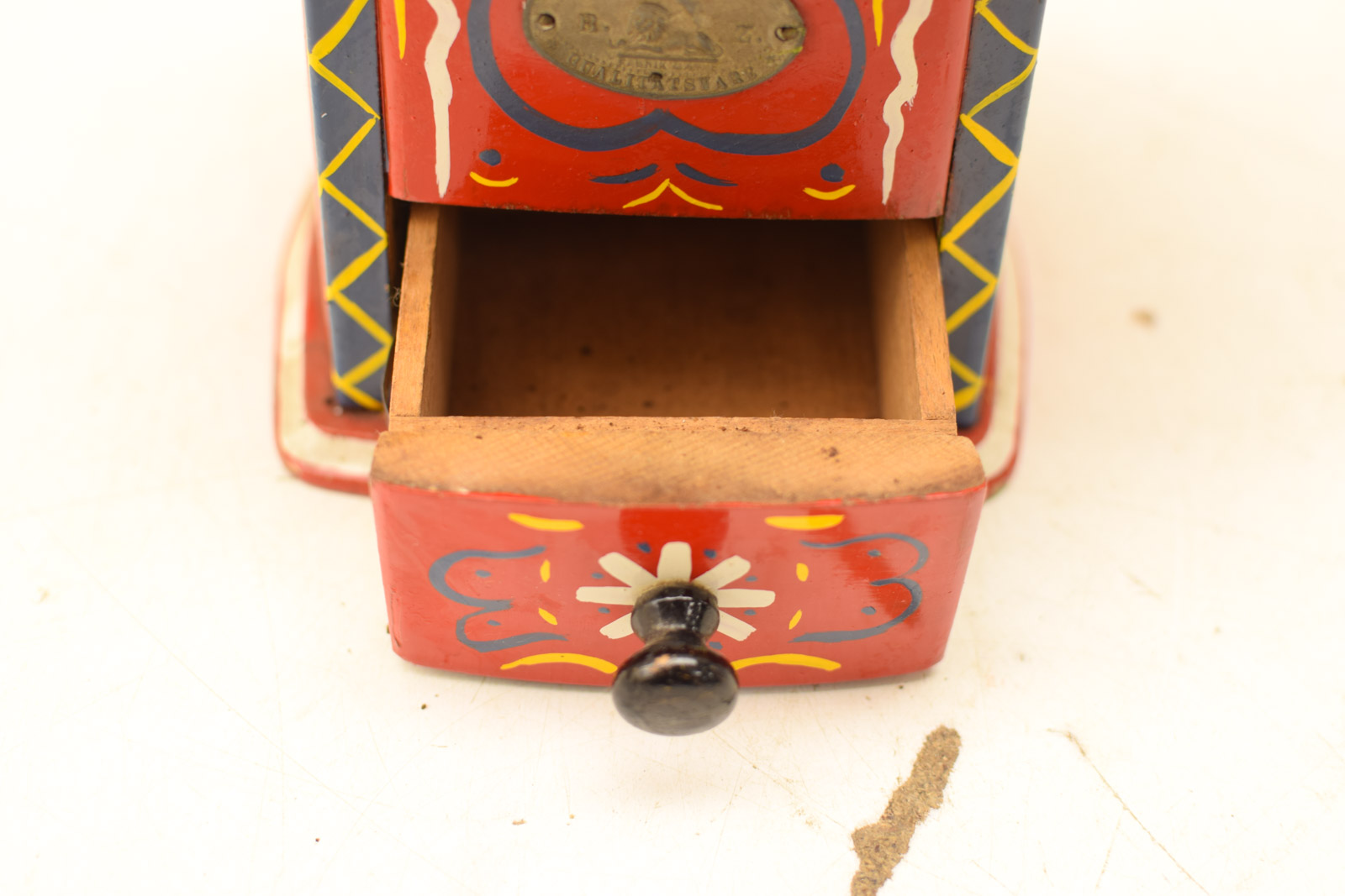 de bovenstuk is van messing en heeft roest het hout heeft vlekken / krassen maar is nog heel het hout is geverfd