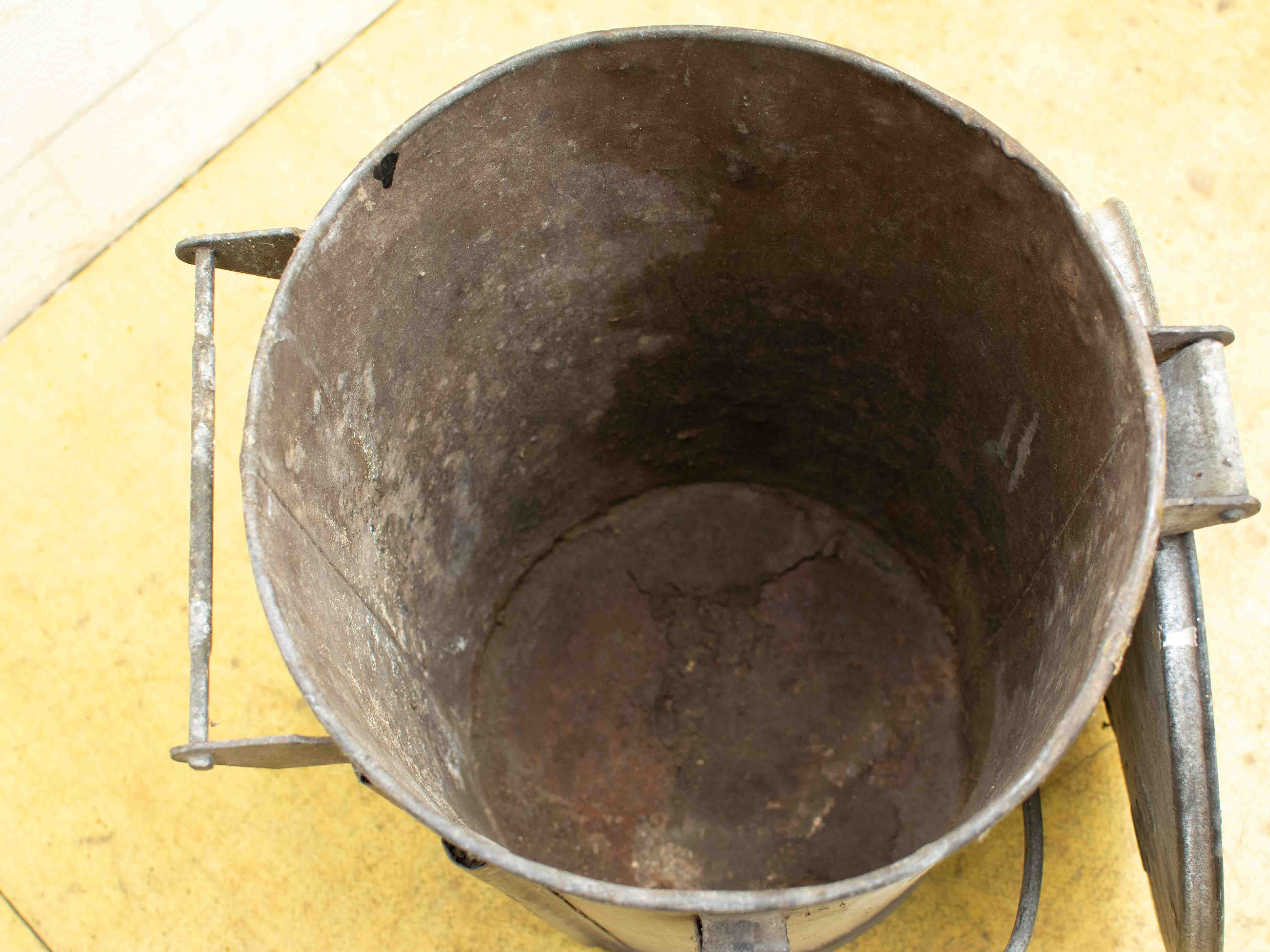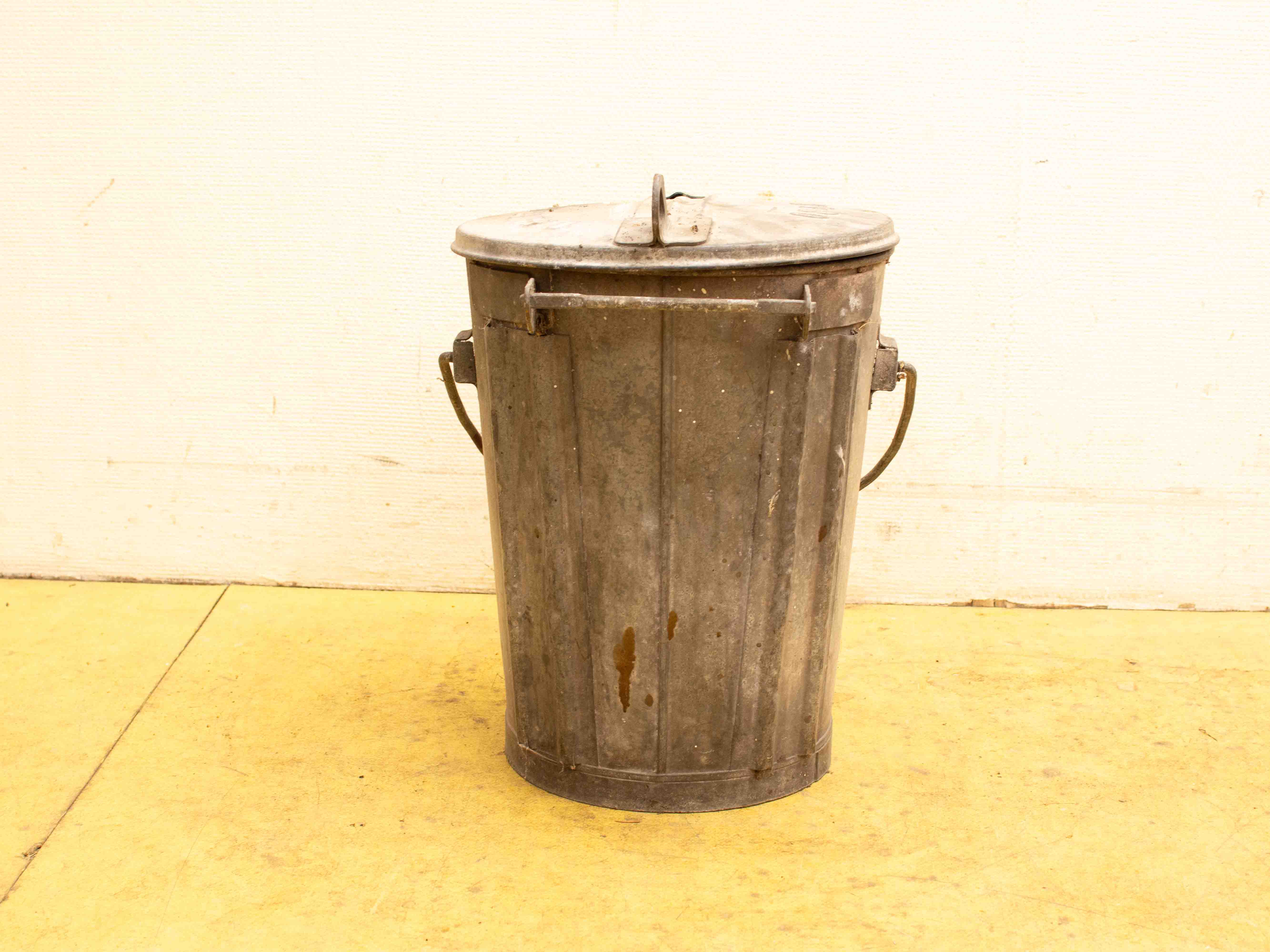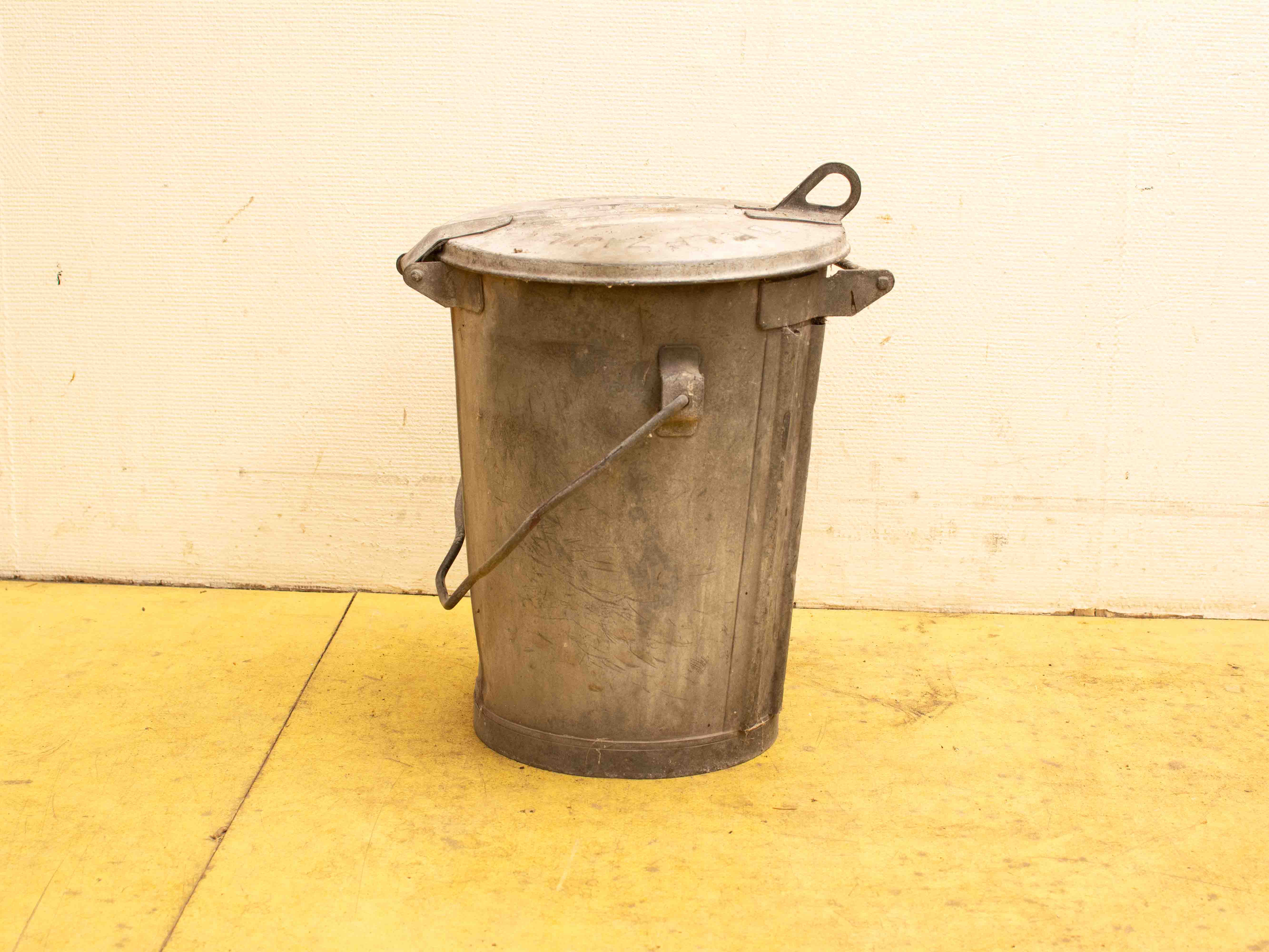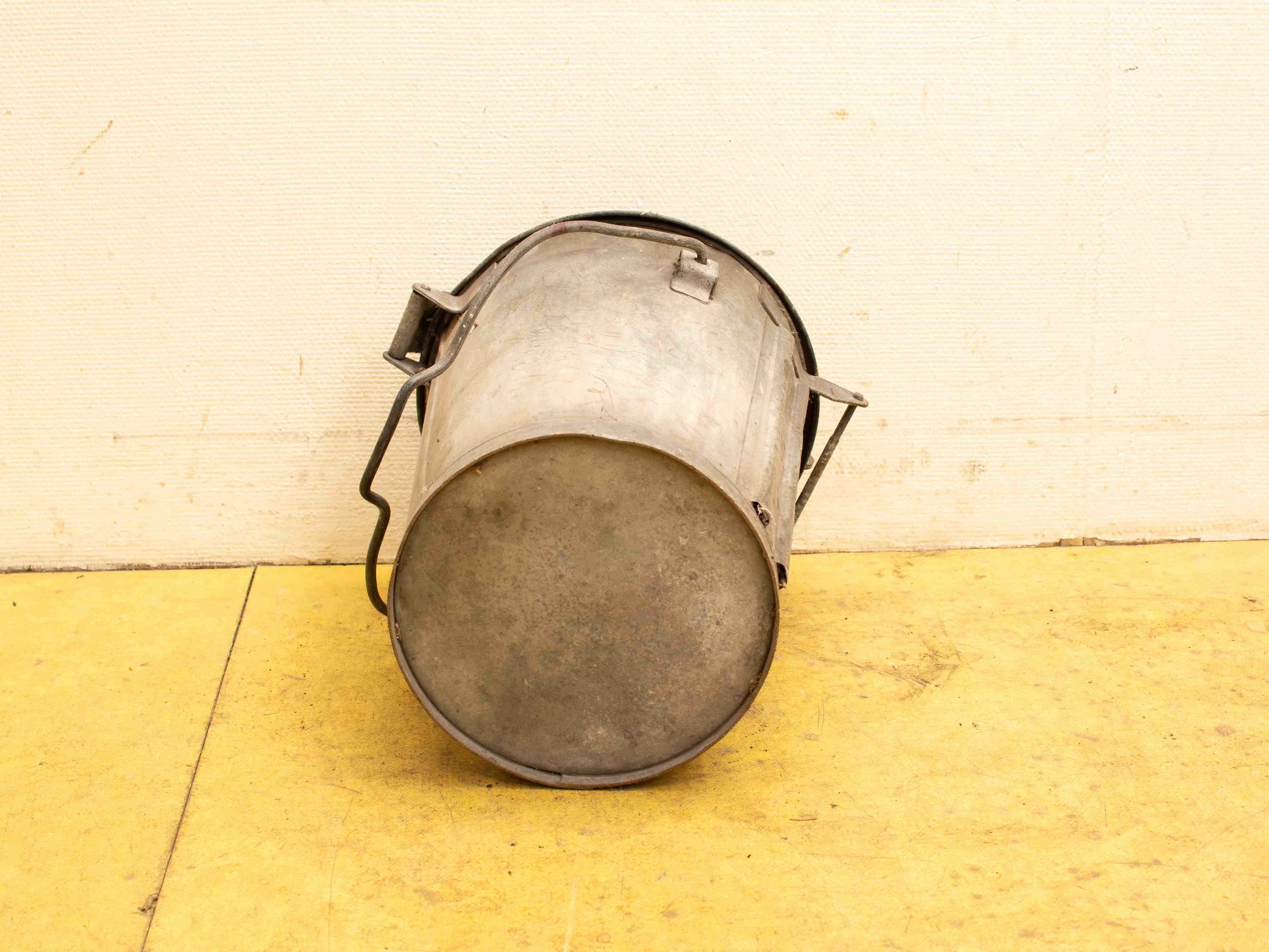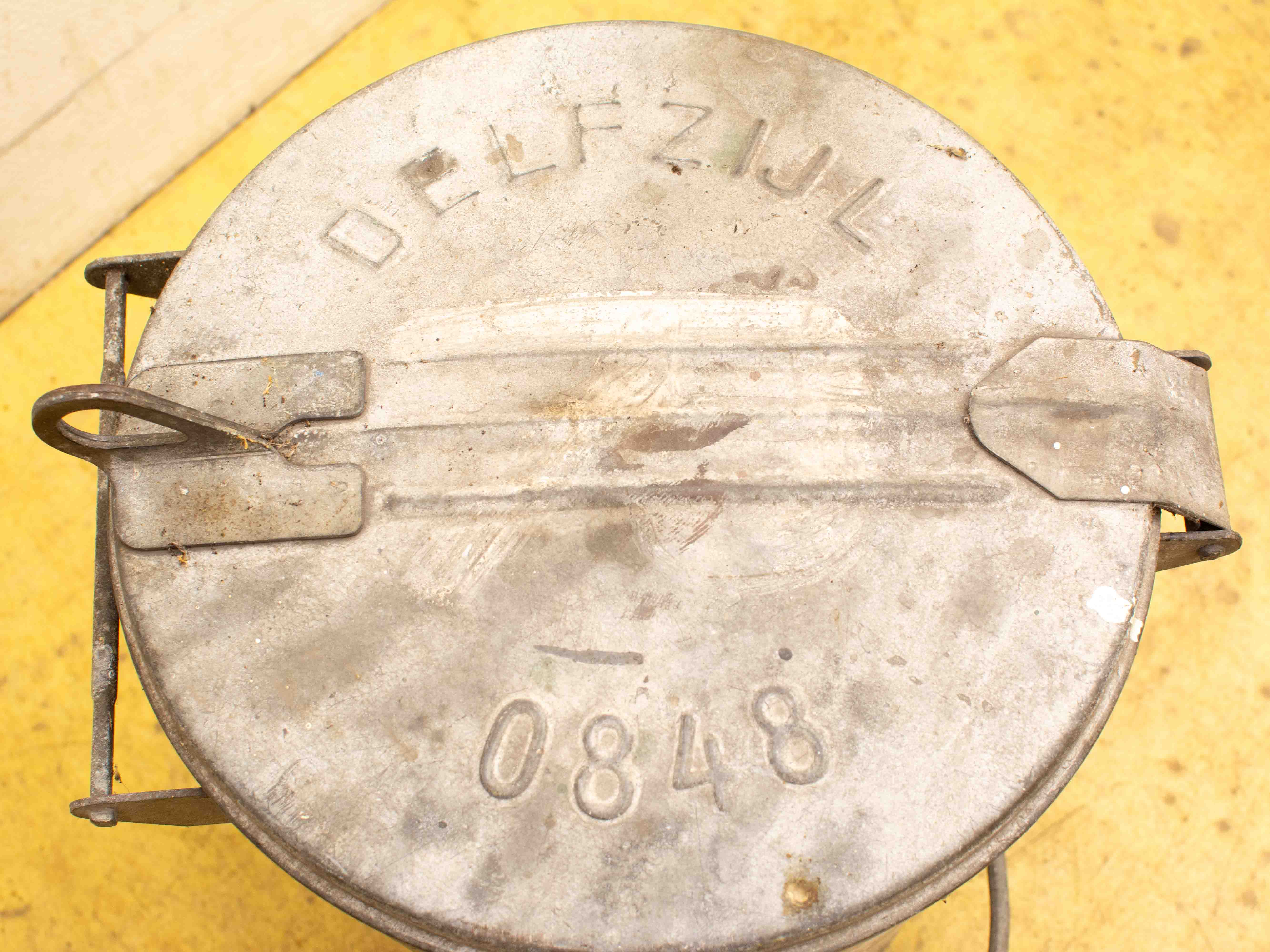 Op de Deksel staat Delfzijl 0848 de vuilnisemmer heeft roetaanslag aan de binnenkant en gebruikssporen