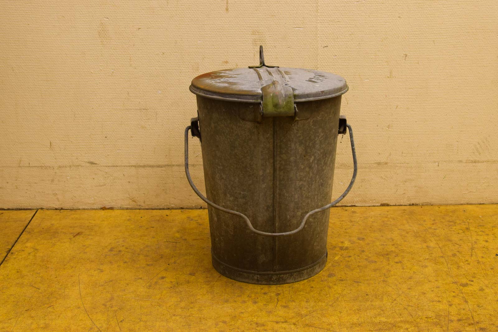 op de deksel staat Groningen 118477 de Zinken Vuilnisemmer heeft roest en gebruikssporen en aanslag aan de binnenkant diameter bovenkant gemeten zonder deksel 35 cm hoog 45 cm